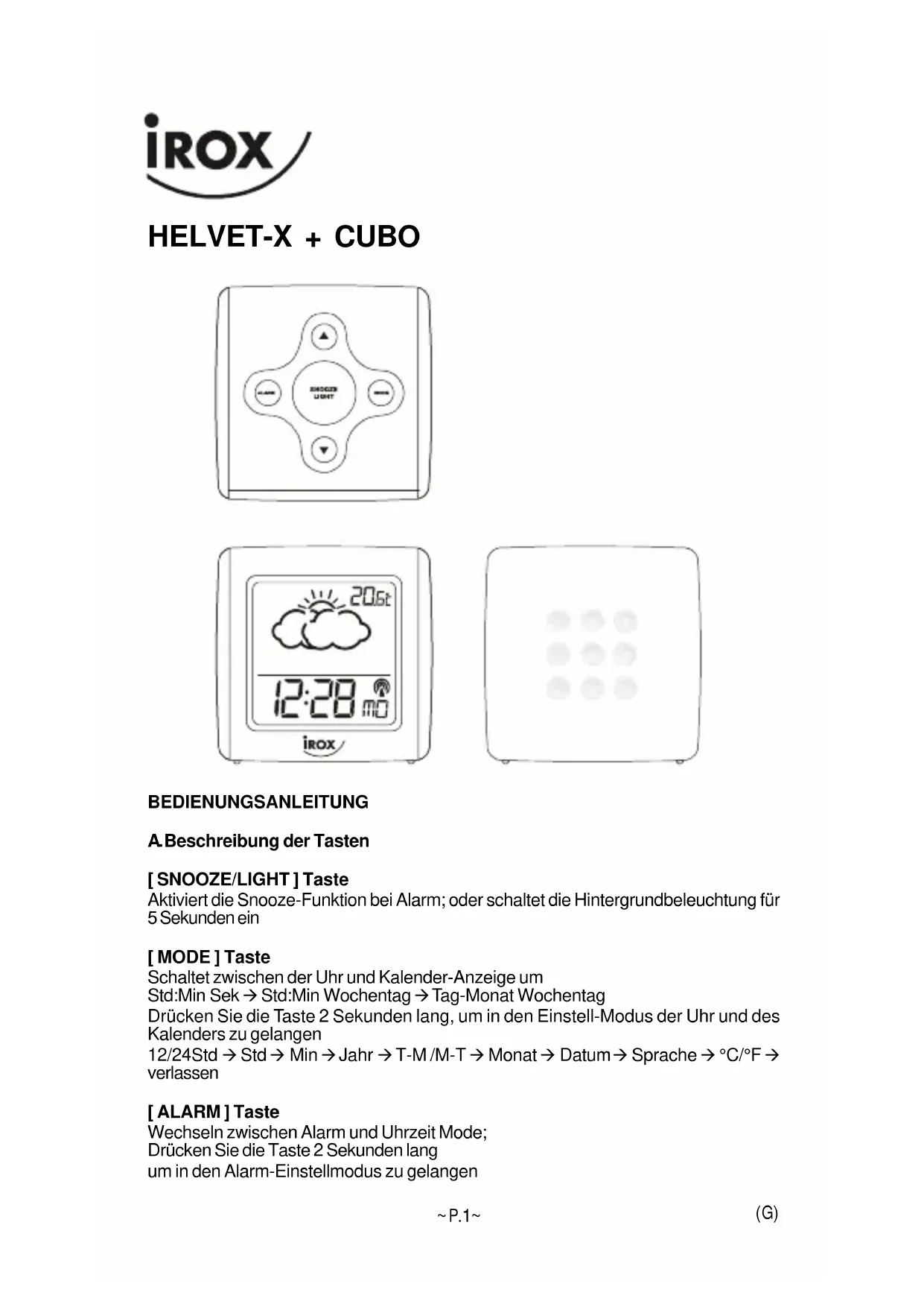 ~P.1~ (G) HELVET-X + CUBO BEDIENUNGSANLEITUNG A. Beschreibung der Tasten [ SNOOZE/LIGHT ] Taste Aktiviert die Snooze-Funktion bei Alarm; oder schaltet die Hintergrundbeleuchtung für 5 Sekunden ein [ MODE ] Taste Schaltet zwischen der Uhr und Kalender-Anzeige um Std:Min Sek à Std:Min Wochentag à Tag-Monat Wochentag Drücken Sie die Taste 2 Sekunden lang, um in den Einstell-Modus der Uhr und des Kalenders zu gelangen 12/24Std à Std à Min à Jahr à T-M /M-T à Monat à Datum à Sprache à °C/°F à verlassen [ ALARM ] Taste Wechseln zwischen Alarm und Uhrzeit Mode; Drücken Sie die Taste 2 Sekunden lang um in den Alarm-Einstellmodus zu gelangen~P.2~ (G) [ ]Taste Erhöht den Wert einer Einstellung Ein-oder Ausschalten des Alarms im Alarm-Modus Display [ ] Taste Verkleinert den Wert einer Einstellung [ RESET ] Taste (im Batteriefach) Führt bei Funktionsstörungen ein System-Reset aus B. DCF 77 Funkuhr Die Funkuhr empfängt das Signal vom DCF77 Sender in Frankfurt/Deutschland. Insofern sich das Gerät im Empfangsbereich des Senders befindet, synchronisiert sich die Zeit automatisch. Der Empfang des Funksignals kann, je nach Signalstärke, bis zu 10 Minuten dauern. Während eines aktiven Empfangs blinkt das Funkturm Symbol