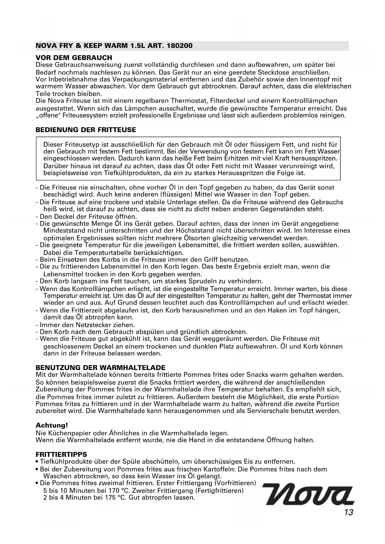 Diese Gebrauchsanweisung zuerst vollständig durchlesen und dann aufbewahren, um später bei Bedarf nochmals nachlesen zu können. Das Gerät nur an eine geerdete Steckdose anschließen. Vor Inbetriebnahme das Verpackungsmaterial entfernen und das Zubehör sowie den Innentopf mit warmem Wasser abwaschen. Vor dem Gebrauch gut abtrocknen. Darauf achten, dass die elektrischen Teile trocken bleiben. Die Nova Friteuse ist mit einem regelbaren Thermostat, Filterdeckel und einem Kontrolllämpchen ausgestattet. Wenn sich das Lämpchen ausschaltet, wurde die gewünschte Temperatur erreicht. Das „offene" Friteusesystem erzielt professionelle Ergebnisse und lässt sich außerdem problemlos reinigen.
