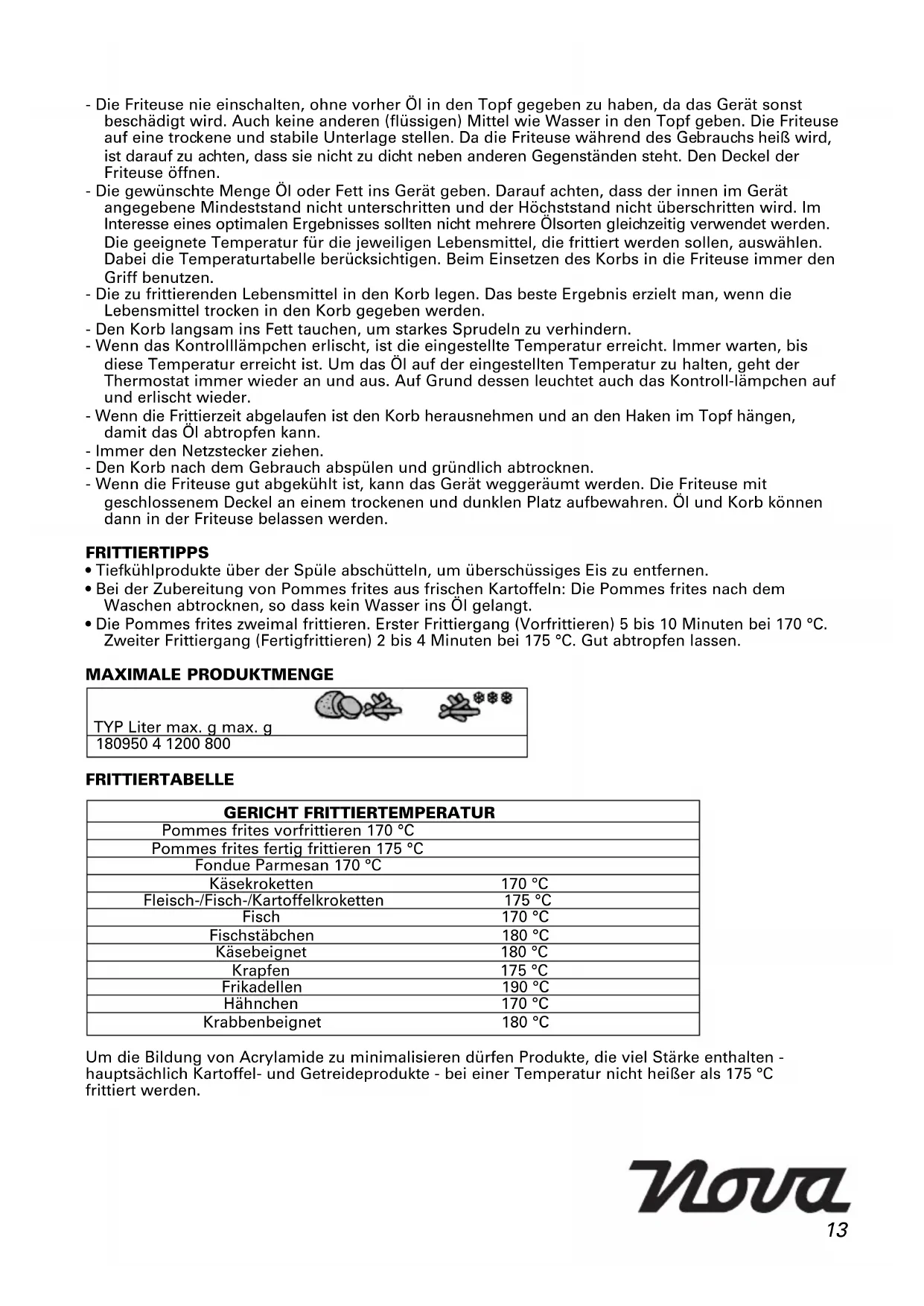 Diese Gebrauchsanweisung zuerst vollständig durchlesen und dann aufbewahren, um später bei Bedarf nochmals nachlesen zu können. Das Gerät nur an eine geerdete Steckdose anschließen. Vor Inbetriebnahme das Verpackungsmaterial entfernen und das Zubehör sowie den Innentopf mit warmem Wasser abwaschen. Vor dem Gebrauch gut abtrocknen. Darauf achten, dass die elektrischen Teile trocken bleiben. Die Nova Friteuse ist mit einem regelbaren Thermostat und einem Kontrolllämpchen ausgestattet. Das leuchtet auf, wenn die Friteuse aufgeheizt wird. Das Lämpchen schaltet sich aus, wenn die gewünschte Temperatur erreicht ist. Das „offene" Friteusesystem erzielt professionelle Ergebnisse und lässt sich außerdem problemlos reinigen.