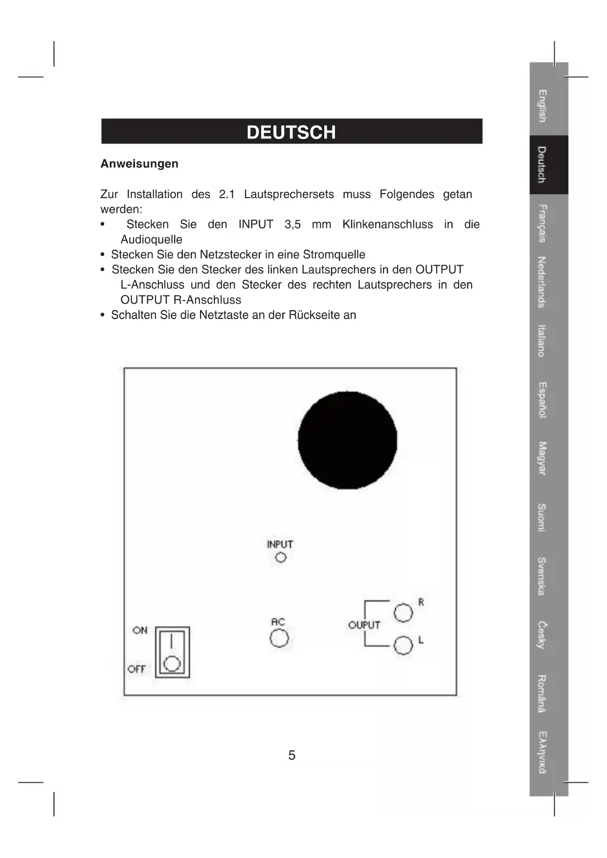 - Stecken Sie den Stecker des linken Lautsprechers in den OUTPUT L-Anschluss und den Stecker des rechten Lautsprechers in den OUTPUT R-Anschluss