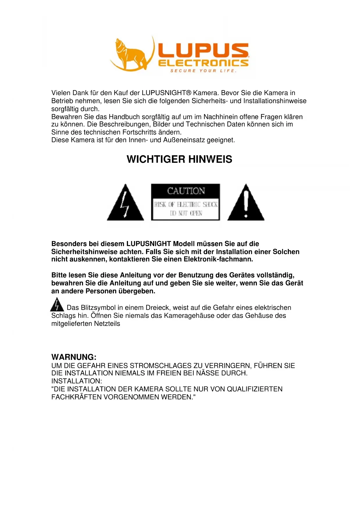 Besonders bei diesem LUPUSNIGHT Modell müssen Sie auf die Sicherheitshinweise achten. Falls Sie sich mit der Installation einer Solchen nicht auskennen, kontaktieren Sie einen Elektronik-fachmann. Bitte lesen Sie diese Anleitung vor der Benutzung des Gerätes vollständig, bewahren Sie die Anleitung auf und geben Sie sie weiter, wenn Sie das Gerät an andere Personen übergeben.