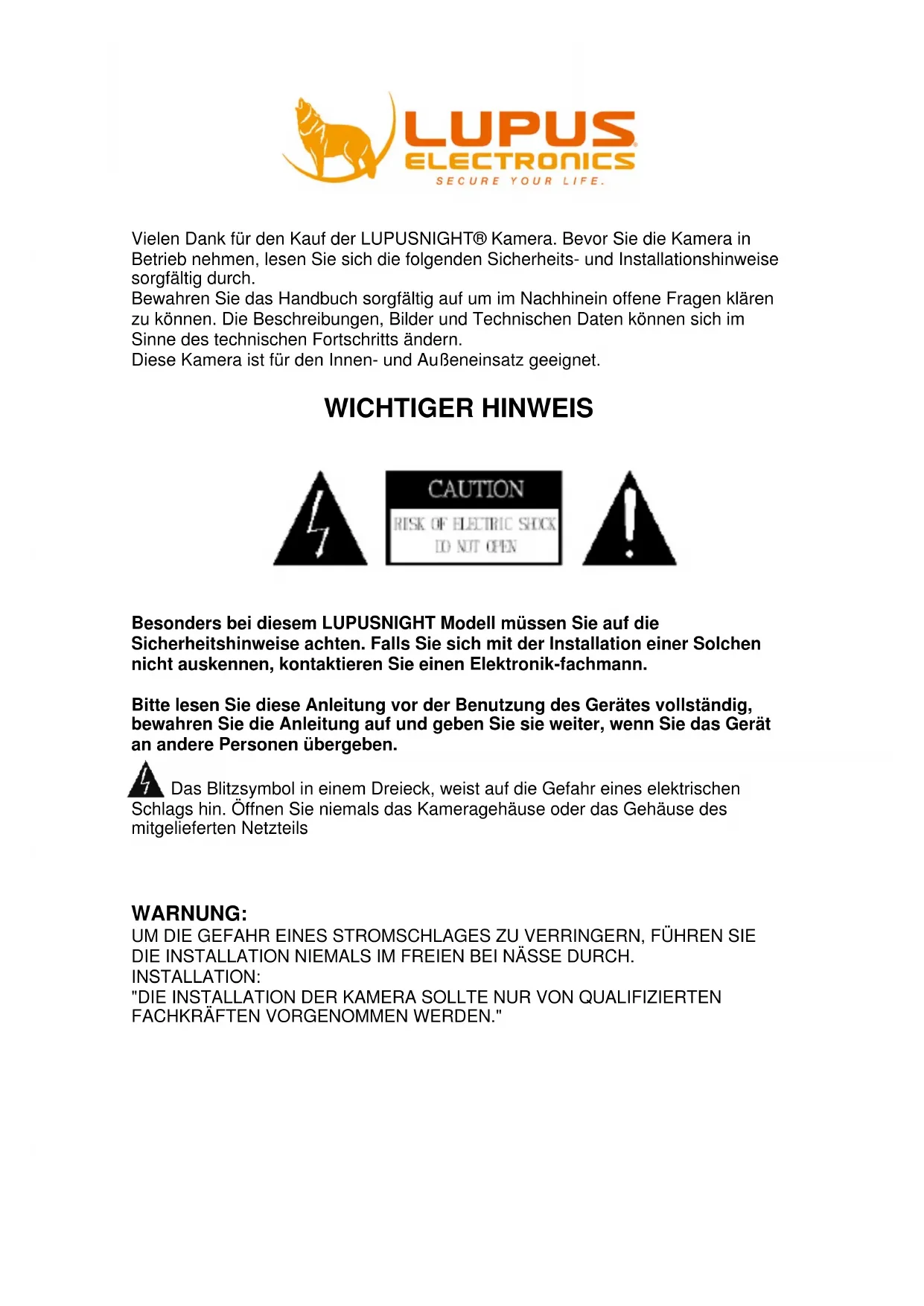 Vielen Dank für den Kauf der LUPUSNIGHT® Kamera. Bevor Sie die Kamera in Betriebnehmen,lesen Sie sich die folgenden Sicherheits- und Installationshinweise sorgfältig durch.