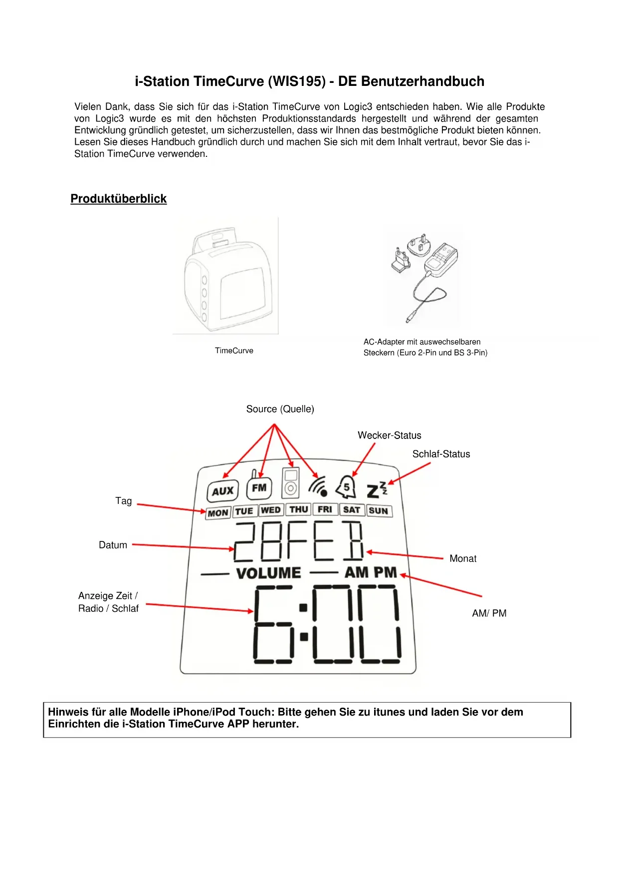 Source (Quelle) Anzeige Zeit / Radio / Schlaf AM/ PM Datum Tag Wecker-Status Monat Schlaf-Status AC-Adapter mit auswechselbaren Steckern (Euro 2-Pin und BS 3-Pin) TimeCurve Hinweis für alle Modelle iPhone/iPod Touch: Bitte gehen Sie zu itunes und laden Sie vor dem Einrichten die i-Station TimeCurve APP herunter.Einrichtung des i-Station TimeCurve