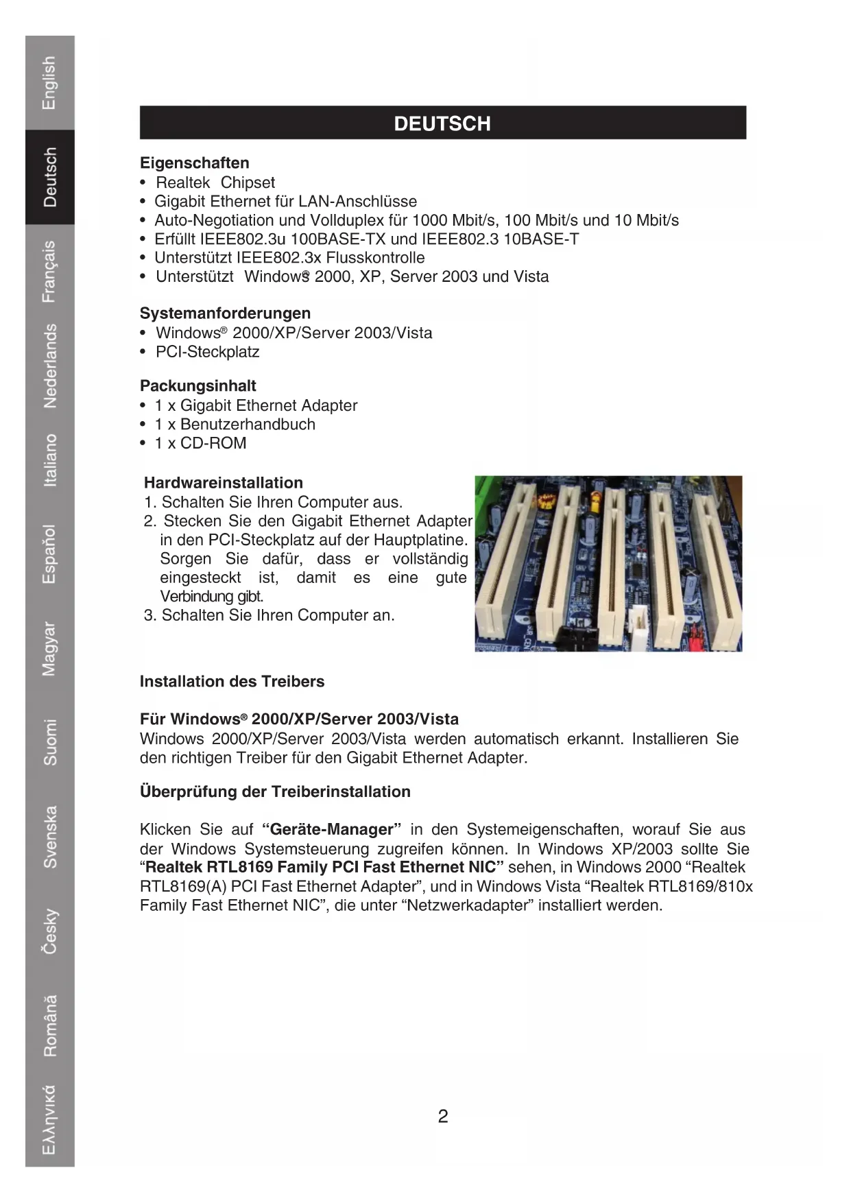 Klicken Sie auf "Geräte-Manager" in den Systemeigenschaften, worauf Sie aus der Windows Systemsteuerung zugreifen konnen. In Windows XP/2003 sollen Sie "Realtek RTL8169 Family PCI Fast Ethernet NIC" sehen, in Windows 2000 "Realtek RTL8169(A) PCI Fast Ethernet Adapter", und in Windows Vista "Realtek RTL8169/810x Family Fast Ethernet NIC", die unter "Netzwerkadapter" installiert werden.