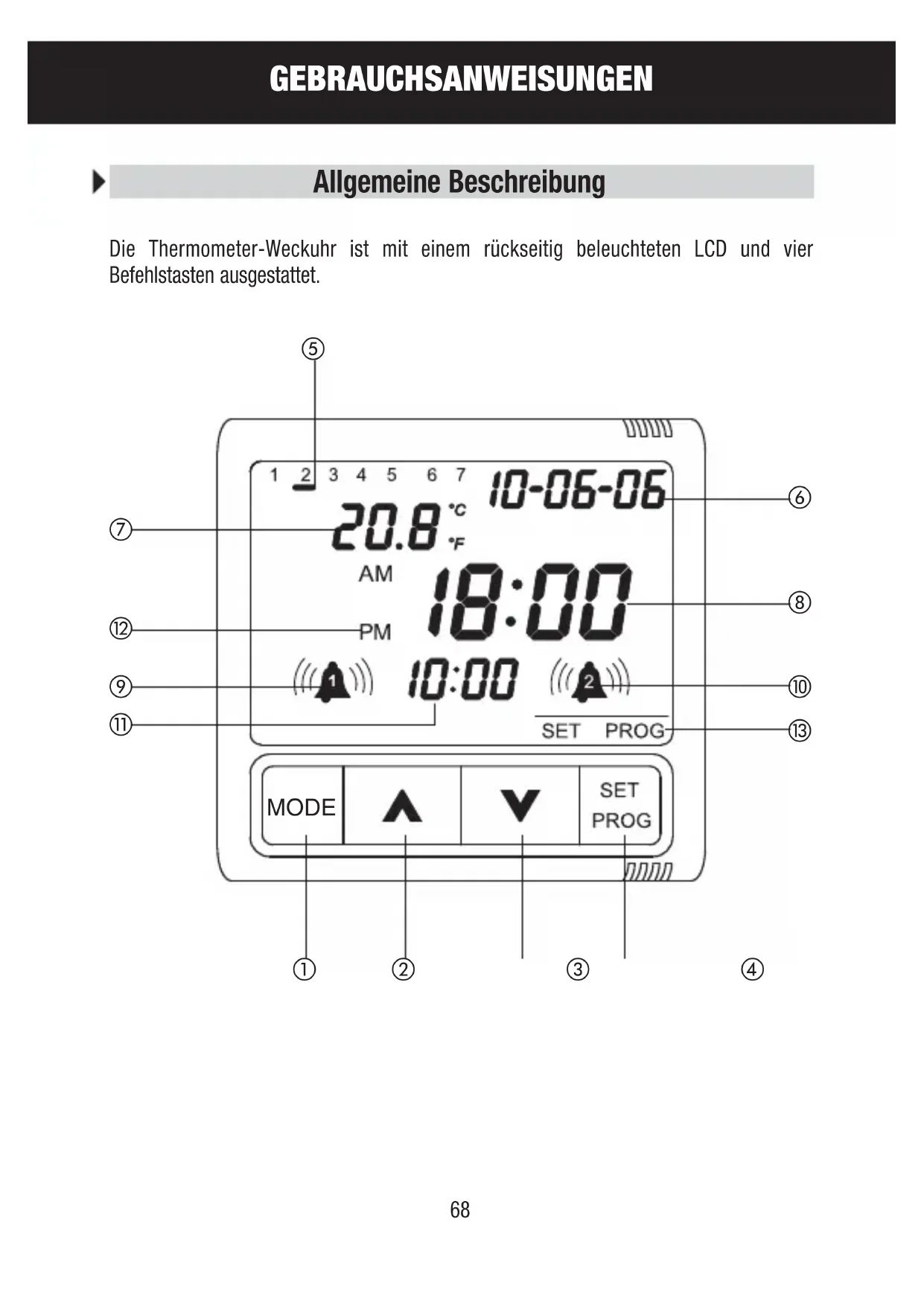 Allgemeine Beschreibung Die Thermometer-Weckuhr ist mit einem rückseitig beleuchteten LCD und vier Befehlstasten ausgestattet. MODE ab c d