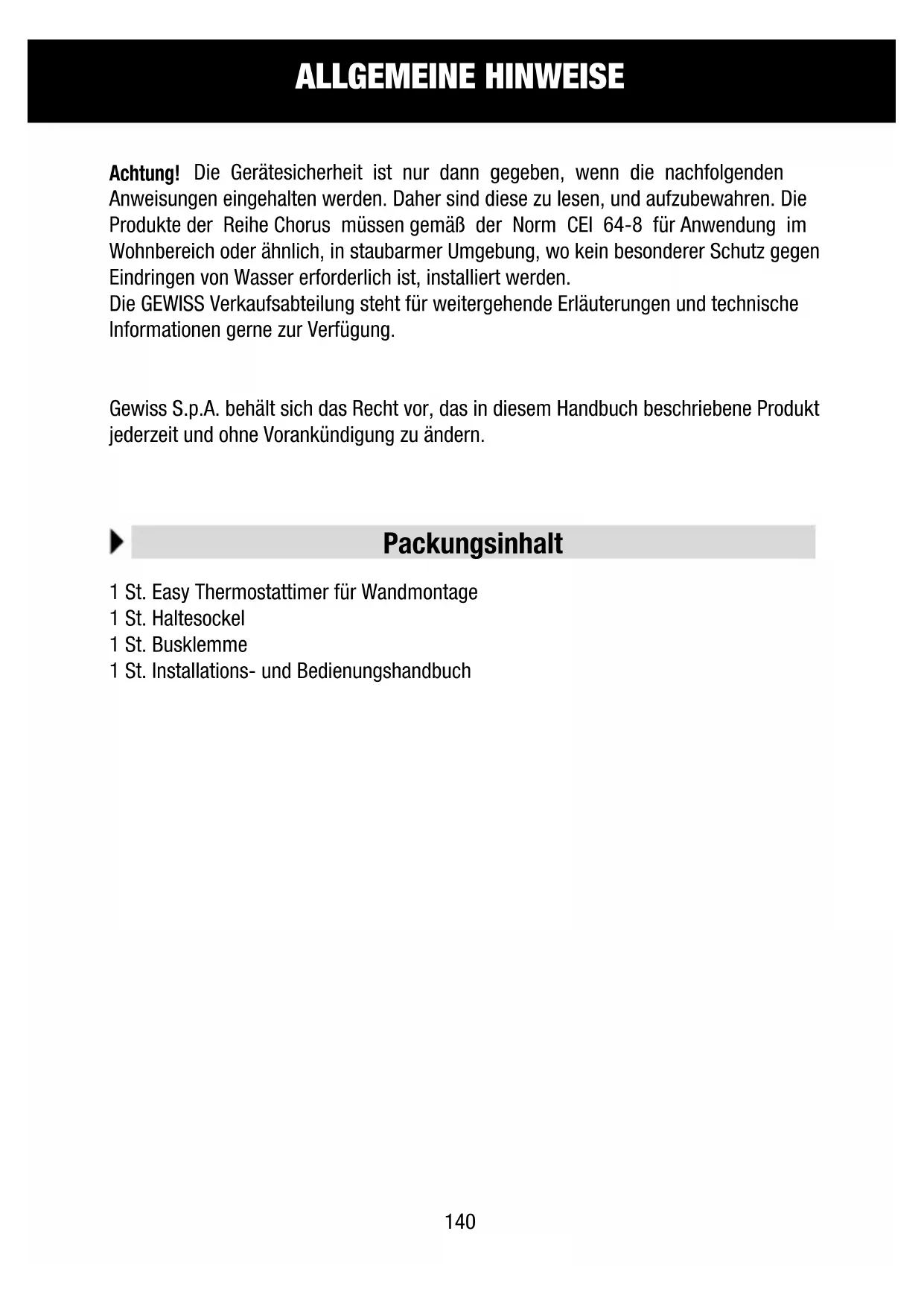 HAchtung! Die Gerätesicherheit ist nur dann gegeben, wenn die nachfolgenden Anweisungen eingehalten werden. Daher sind diese zu lesen, und aufzubewahren. Die Produkte der Reihe Chorus müssen gemäß der Norm CEI 64-8 für Anwendung im Wohnbereich oder ähnlich, in staubarmer Umgebung, wo kein besonderer Schutz gegen Eindringen von Wasser erforderlich ist, installiert werden. Die GEWISS Verkaufsabteilung steht für weitergehende Erläuterungen und technische Informationen gerne zur Verfügung. Gewiss S.p.A. behält sich das Recht vor, das in diesem Handbuch beschriebene Produkt jederzeit und ohne Vorankündigung zu ändern. 1 St. Easy Thermostattimer für Wandmontage 1 St. Haltesockel 1 St. Busklemme 1 St. Installations- und Bedienungshandbuch ALLGEMEINE HINWEISE