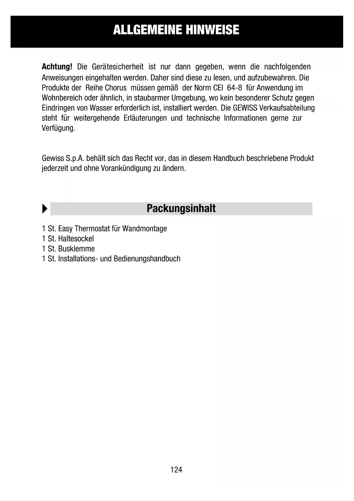 Achtung! Die Gerätesicherheit ist nur dann gegeben, wenn die nachfolgenden Anweisungen eingehalten werden. Daher sind diese zu lesen, und aufzubewahren. Die Produkte der Reihe Chorus müssen gemäß der Norm CEI 64-8 für Anwendung im Wohnbereich oder ähnlich, in staubarmer Umgebung, wo kein besonderer Schutz gegen Eindringen von Wasser erforderlich ist, installiert werden. Die GEWISS Verkaufsabteilung steht für weitergehende Erläuterungen und technische Informationenigeria zur Verfugung.