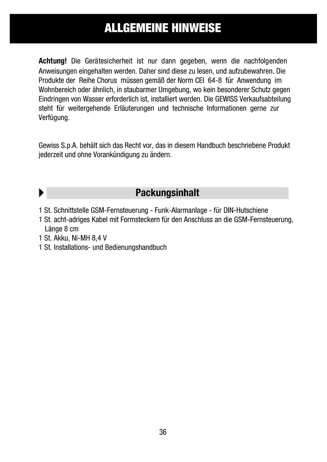 Achtung! Die Gerätesicherheit ist nur dann gegeben, wenn die nachfolgenden Anweisungen eingehalten werden. Daher sind diese zu lesen, und aufzubewahren. Die Produkte der Reihe Chorus müssen gemäß der Norm CEI 64-8 für Anwendung im Wohnbereich oder ähnlich, in staubarmer Umgebung, wo kein besonderer Schutz gegen Eindringen von Wasser erforderlich ist, installiert werden. Die GEWISS Verkaufsabteilung steht für weitergehende Erläuterungen und technische Informationenigeria zur Verfugung.