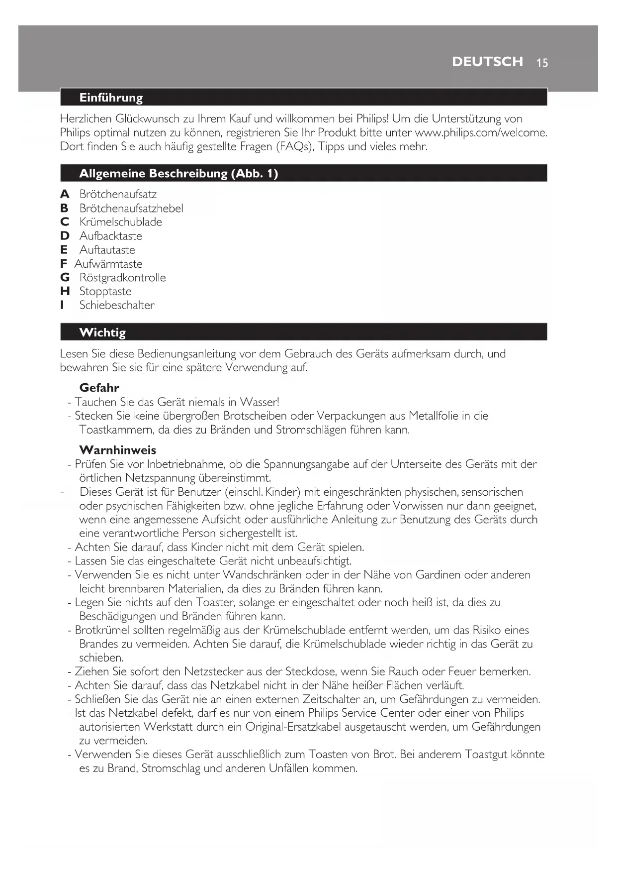 - Der Toaster ist ausschließlich für den häuslichen Gebrauch vorgesehen und darf nicht im Freien