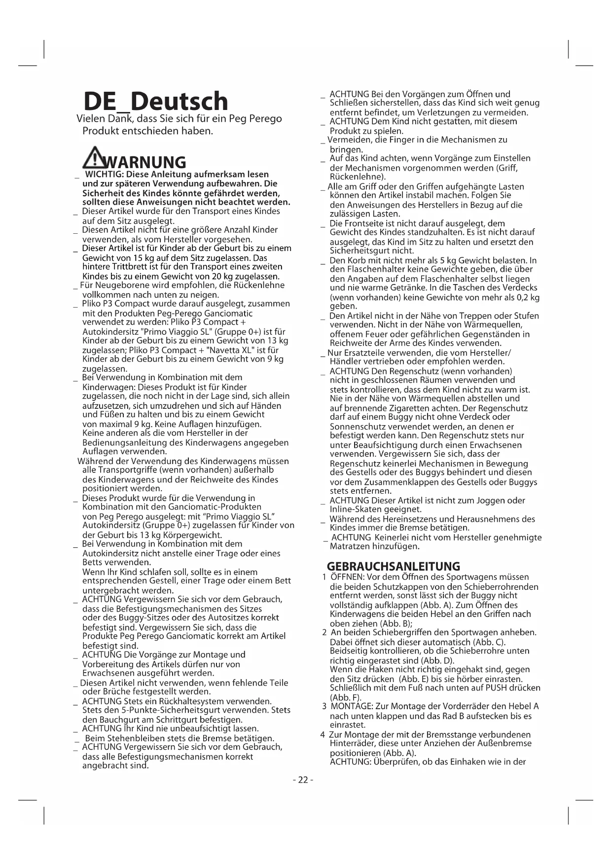 WARNUNG _ WICHTIG: Diese Anleitung aufmerksam lesen und zur späteren Verwendung aufbewahren. Die Sicherheit des Kindes könnte gefährdet werden, sollten diese Anweisungen nicht beachtet werden. _ Dieser Artikel wurde für den Transport eines Kindes auf dem Sitz ausgelegt. _ Diesen Artikel nicht für eine größere Anzahl Kinder verwenden, als vom Hersteller vorgesehen. _ Dieser Artikel ist für Kinder ab der Geburt bis zu einem Gewicht von 15 kg auf dem Sitz zugelassen. Das hintere Trittbrett ist für den Transport eines zweiten Kindes bis zu einem Gewicht von 20 kg zugelassen. _ Für Neugeborene wird empfohlen, die Rückenlehne vollkommen nach unten zu neigen. _ Pliko P3 Compact wurde darauf ausgelegt, zusammen mit den Produkten Peg-Perego Ganciomatic verwendet zu werden: Pliko P3 Compact + Autokindersitz "Primo Viaggio SL" (Gruppe 0+) ist für Kinder ab der Geburt bis zu einem Gewicht von 13 kg zugelassen; Pliko P3 Compact + "Navetta XL" ist für Kinder ab der Geburt bis zu einem Gewicht von 9 kg zugelassen. _ Bei Verwendung in Kombination mit dem Kinderwagen: Dieses Produkt ist für Kinder zugelassen, die noch nicht in der Lage sind, sich allein aufzusetzen, sich umzudrehen und sich auf Händen und Füßen zu halten und bis zu einem Gewicht von maximal 9 kg. Keine Auflagen hinzufügen. Keine anderen als die vom Hersteller in der Bedienungsanleitung des Kinderwagens angegeben Auflagen verwenden. Während der Verwendung des Kinderwagens müssen alle Transportgriffe (wenn vorhanden) außerhalb des Kinderwagens und der Reichweite des Kindes positioniert werden. _ Dieses Produkt wurde für die Verwendung in Kombination mit den Ganciomatic-Produkten von Peg Perego ausgelegt: mit “Primo Viaggio SL” Autokindersitz (Gruppe 0+) zugelassen für Kinder von der Geburt bis 13 kg Körpergewicht. _ Bei Verwendung in Kombination mit dem Autokindersitz nicht anstelle einer Trage oder eines Betts verwenden. Wenn Ihr Kind schlafen soll, sollte es in einem entsprechenden Gestell, einer Trage oder einem Bett untergebracht werden. _ ACHTUNG Vergewissern Sie sich vor dem Gebrauch, dass die Befestigungsmechanismen des Sitzes oder des Buggy-Sitzes oder des Autositzes korrekt befestigt sind. Vergewissern Sie sich, dass die Produkte Peg Perego Ganciomatic korrekt am Artikel befestigt sind. _ ACHTUNG Die Vorgänge zur Montage und Vorbereitung des Artikels dürfen nur von Erwachsenen ausgeführt werden. _ Diesen Artikel nicht verwenden, wenn fehlende Teile oder Brüche festgestellt werden. _ ACHTUNG Stets ein Rückhaltesystem verwenden. Stets den 5-Punkte-Sicherheitsgurt verwenden. Stets den Bauchgurt am Schrittgurt befestigen. _ ACHTUNG Ihr Kind nie unbeaufsichtigt lassen. _ Beim Stehenbleiben stets die Bremse betätigen. _ ACHTUNG Vergewissern Sie sich vor dem Gebrauch, dass alle Befestigungsmechanismen korrekt angebracht sind. _ ACHTUNG Bei den Vorgängen zum Öffnen und Schließen sicherstellen, dass das Kind sich weit genug entfernt befindet, um Verletzungen zu vermeiden. _ ACHTUNG Dem Kind nicht gestatten, mit diesem Produkt zu spielen. _ Vermeiden, die Finger in die Mechanismen zu bringen. _ Auf das Kind achten, wenn Vorgänge zum Einstellen der Mechanismen vorgenommen werden (Griff, Rückenlehne). _ Alle am Griff oder den Griffen aufgehängte Lasten können den Artikel instabil machen. Folgen Sie den Anweisungen des Herstellers in Bezug auf die zulässigen Lasten. _ Die Frontseite ist nicht darauf ausgelegt, dem Gewicht des Kindes standzuhalten. Es ist nicht darauf ausgelegt, das Kind im Sitz zu halten und ersetzt den Sicherheitsgurt nicht. _ Den Korb mit nicht mehr als 5 kg Gewicht belasten. In den Flaschenhalter keine Gewichte geben, die über den Angaben auf dem Flaschenhalter selbst liegen und nie warme Getränke. In die Taschen des Verdecks (wenn vorhanden) keine Gewichte von mehr als 0,2 kg geben. _ Den Artikel nicht in der Nähe von Treppen oder Stufen verwenden. Nicht in der Nähe von Wärmequellen, offenem Feuer oder gefährlichen Gegenständen in Reichweite der Arme des Kindes verwenden. _ Nur Ersatzteile verwenden, die vom Hersteller/Händler vertrieben oder empfohlen werden. _ ACHTUNG Den Regenschutz (wenn vorhanden) nicht in geschlossenen Räumen verwenden und stets kontrollieren, dass dem Kind nicht zu warm ist. Nie in der Nähe von Wärmequellen abstellen und auf brennende Zigaretten achten. Der Regenschutz darf auf einem Buggy nicht ohne Verdeck oder Sonnenschutz verwendet werden, an denen er befestigt werden kann. Den Regenschutz stets nur unter Beaufsichtigung durch einen Erwachsenen verwenden. Vergewissern Sie sich, dass der Regenschutz keinerlei Mechanismen in Bewegung des Gestells oder des Buggys behindert und diesen vor dem Zusammenklappen des Gestells oder Buggys stets entfernen. _ ACHTUNG Dieser Artikel ist nicht zum Joggen oder Inline-Skaten geeignet. _ Während des Hereinsetzens und Herausnehmens des Kindes immer die Bremse betätigen. _ ACHTUNG Keinerlei nicht vom Hersteller genehmigte Matratzen hinzufügen. GEBRAUCHSANLEITUNG 1 ÖFFNEN: Vor dem Öffnen des Sportwagens müssen die beiden Schutzkappen von den Schieberrohrenden entfernt werden, sonst lässt sich der Buggy nicht vollständig aufklappen (Abb. A). Zum Öffnen des Kinderwagens die beiden Hebel an den Griffen nach oben ziehen (Abb. B); 2 An beiden Schiebergriffen den Sportwagen anheben. Dabei öffnet sich dieser automatisch (Abb. C). Beidseitig kontrollieren, ob die Schieberrohre unten richtig eingerastet sind (Abb. D). Wenn die Haken nicht richtig eingehakt sind, gegen den Sitz drücken (Abb. E) bis sie hörber einrasten. Schließlich mit dem Fuß nach unten auf PUSH drücken (Abb. F). 3 MONTAGE: Zur Montage der Vorderräder den Hebel A nach unten klappen und das Rad B aufstecken bis es einrastet. 4 Zur Montage der mit der Bremsstange verbundenen Hinterräder, diese unter Anziehen der Außenbremse positionieren (Abb. A). ACHTUNG: Überprüfen, ob das Einhaken wie in der- 23 -
