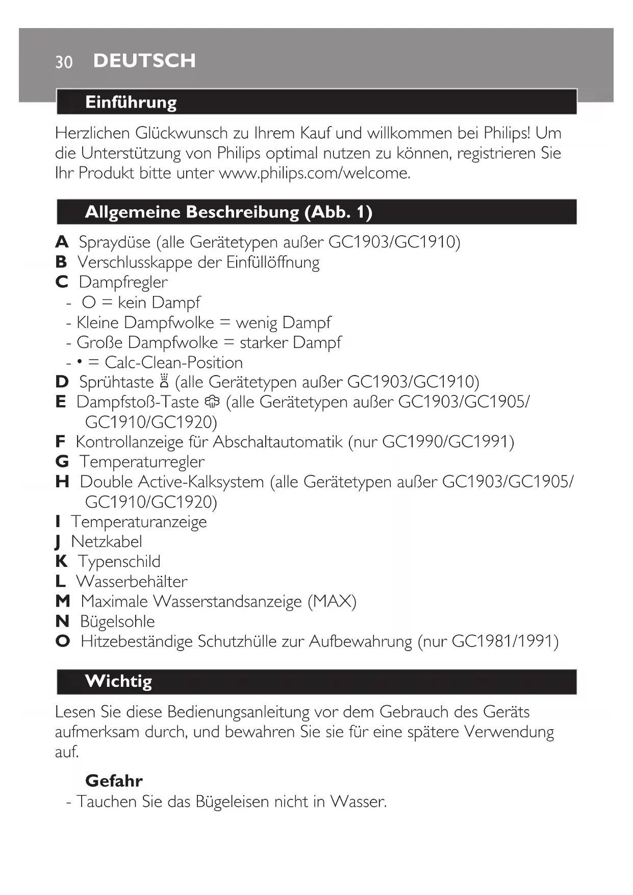 - Tauchen Sie das Bügeleisen nicht in Wasser.
