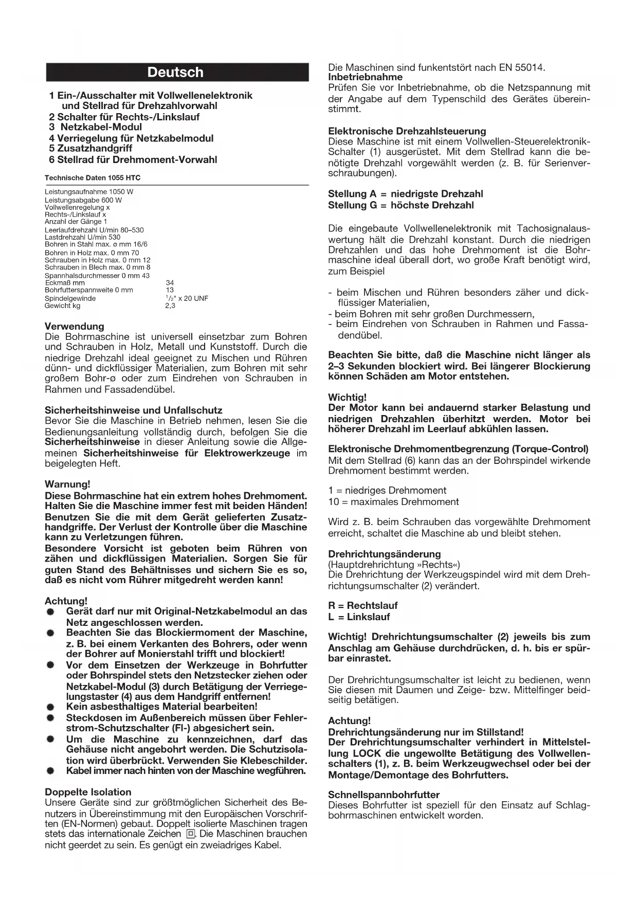 1055 HTC 49029_a/1102Deutsch 1 Ein-/Ausschalter mit Vollwellenelektronik und Stellrad für Drehzahlvorwahl 2 Schalter für Rechts-/Linkslauf 3 Netzkabel-Modul 4 Verriegelung für Netzkabelmodul 5 Zusatzhandgriff 6 Stellrad für Drehmoment-Vorwahl Technische Daten 1055 HTC Leistungsaufnahme 1050 W Leistungsabgabe 600 W Vollwellenregelung x Rechts-/Linkslauf x Anzahl der Gänge 1 Leerlaufdrehzahl U/min 80–530 Lastdrehzahl U/min 530 Bohren in Stahl max. ø mm 16/6 Bohren in Holz max. 0 mm 70 Schrauben in Holz max. 0 mm 12 Schrauben in Blech max. 0 mm 8 Spannhalsdurchmesser 0 mm 43 43mm ßamkcE Bohrfutterspannweite 0 mm 13 Spindelgewinde