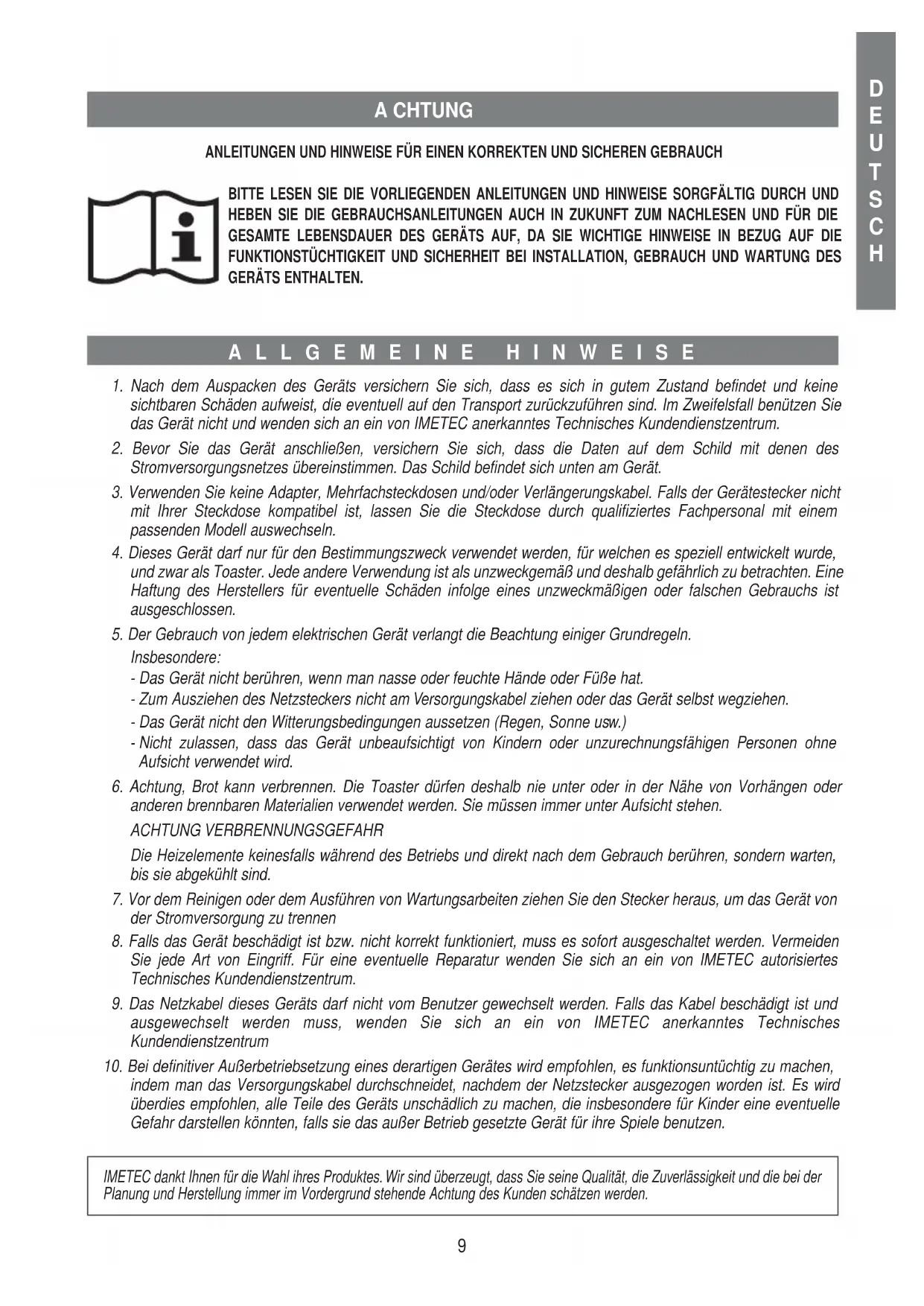 A CHTUNG ALLGEMEINE HINWEISE D E U T S C H IMETEC dankt Ihnen für die Wahl ihres Produktes.Wir sind überzeugt, dass Sie seine Qualität, die Zuverlässigkeit und die bei der