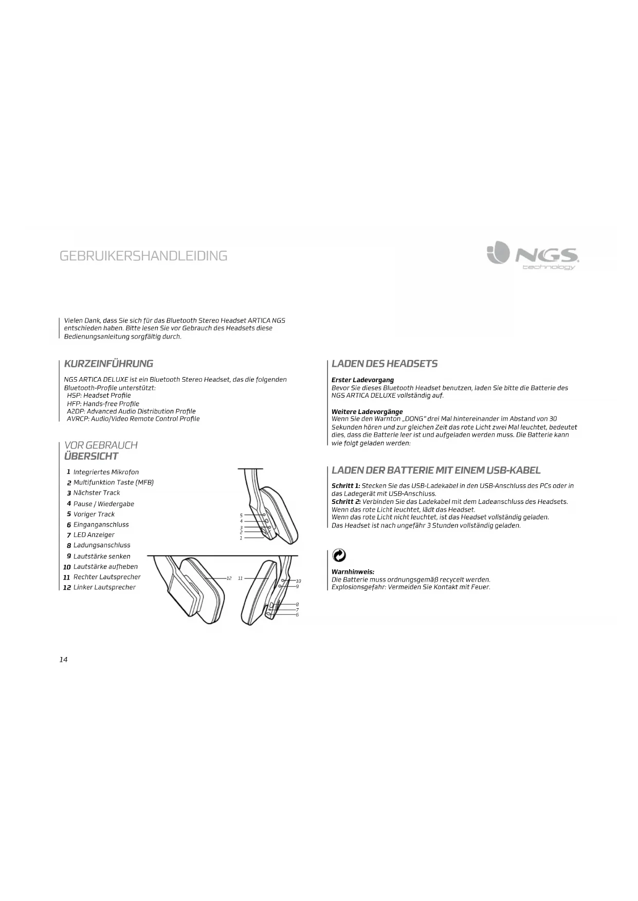 GEBRUIKERSHANDLEIDING Vielen Dank, dass Sie sich für das Bluetooth Stereo Headset ARTICA NGS