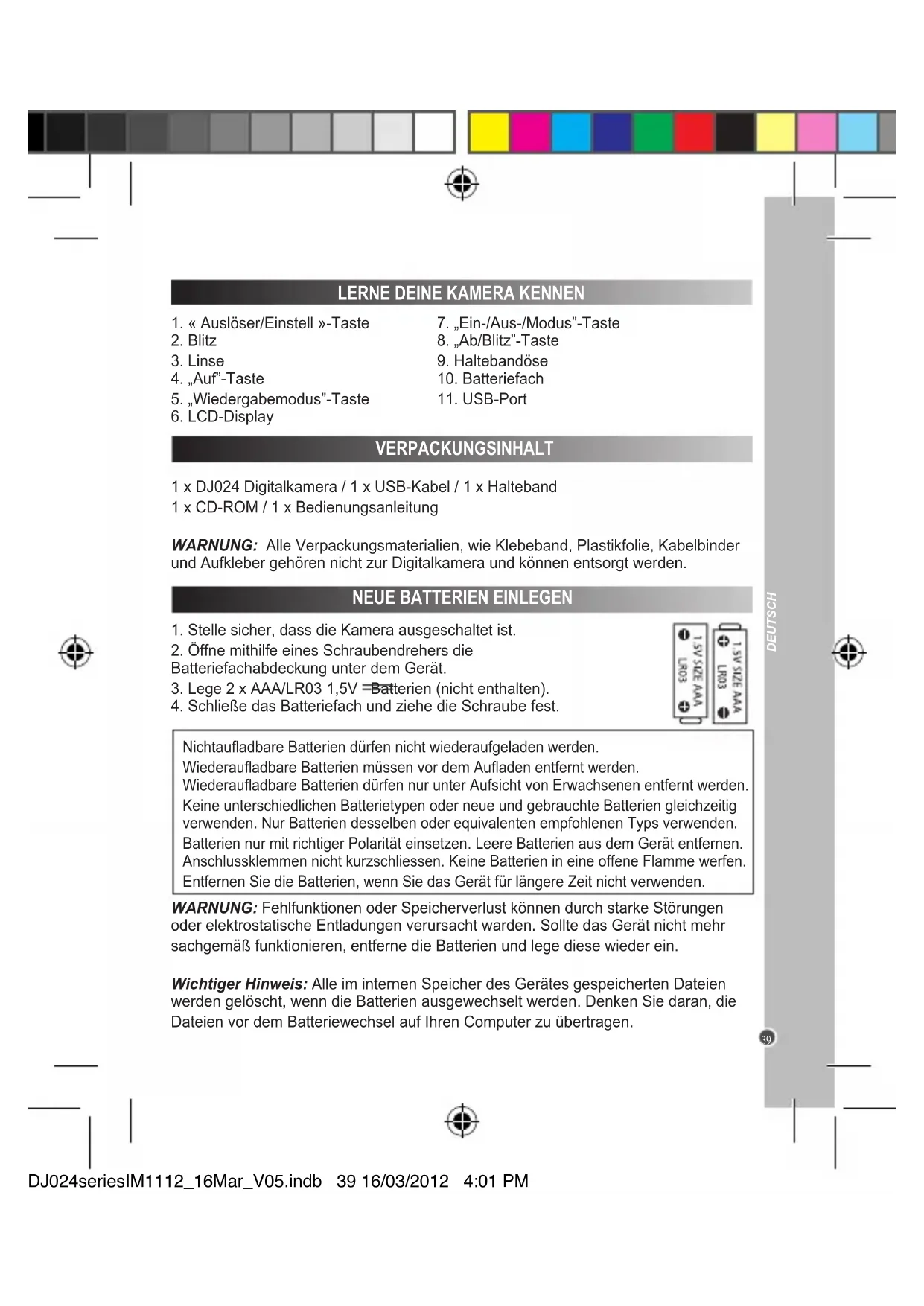 DEUTSCH LERNE DEINE KAMERA KENNEN NEUE BATTERIEN EINLEGEN VERPACKUNGSINHALT Nichtauadbare Batterien dürfen nicht wiederaufgeladen werden.