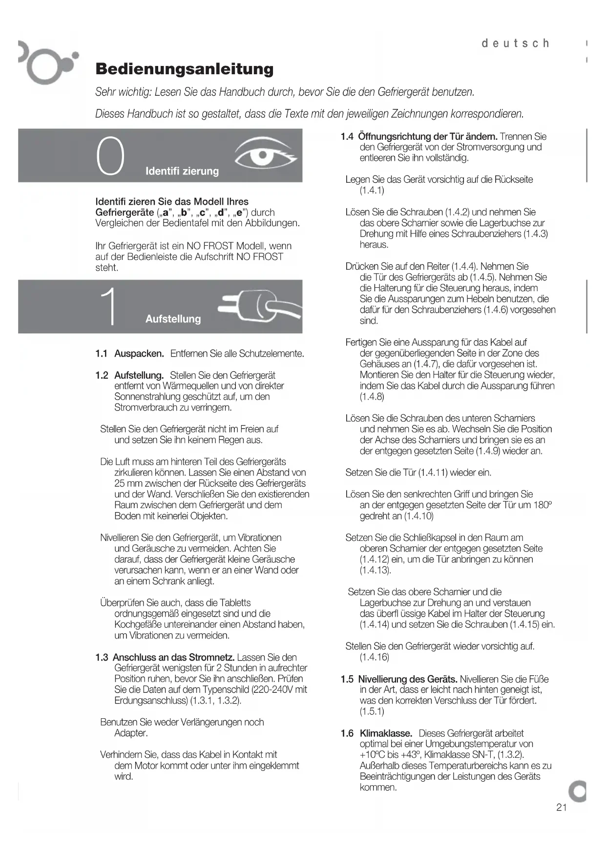 1.2 Aufstellung. Stellen Sie den Gefriergerät