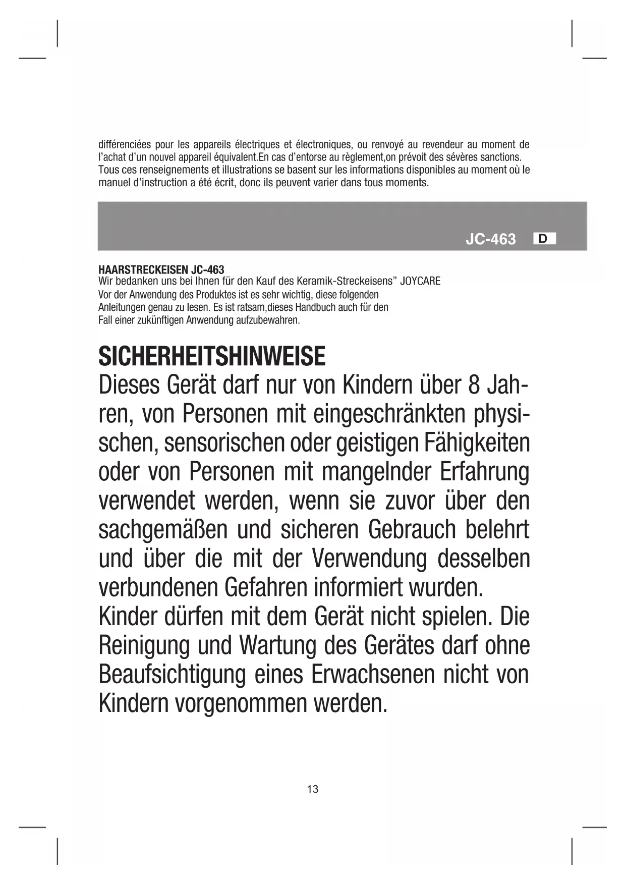 HAARSTRECKEISEN JC-463 Wir bedanken uns bei Ihnen für den Kauf des Keramik-Streckeisens” JOYCARE Vor der Anwendung des Produktes ist es sehr wichtig, diese folgenden Anleitungen genau zu lesen. Es ist ratsam,dieses Handbuch auch für den Fall einer zukünftigen Anwendung aufzubewahren. SICHERHEITSHINWEISE Dieses Gerät darf nur von Kindern über 8 Jah- ren, von Personen mit eingeschränkten physi- schen, sensorischen oder geistigen Fähigkeiten oder von Personen mit mangelnder Erfahrung verwendet werden, wenn sie zuvor über den sachgemäßen und sicheren Gebrauch belehrt und über die mit der Verwendung desselben verbundenen Gefahren informiert wurden. Kinder dürfen mit dem Gerät nicht spielen. Die Reinigung und Wartung des Gerätes darf ohne Beaufsichtigung eines Erwachsenen nicht von Kindern vorgenommen werden.14