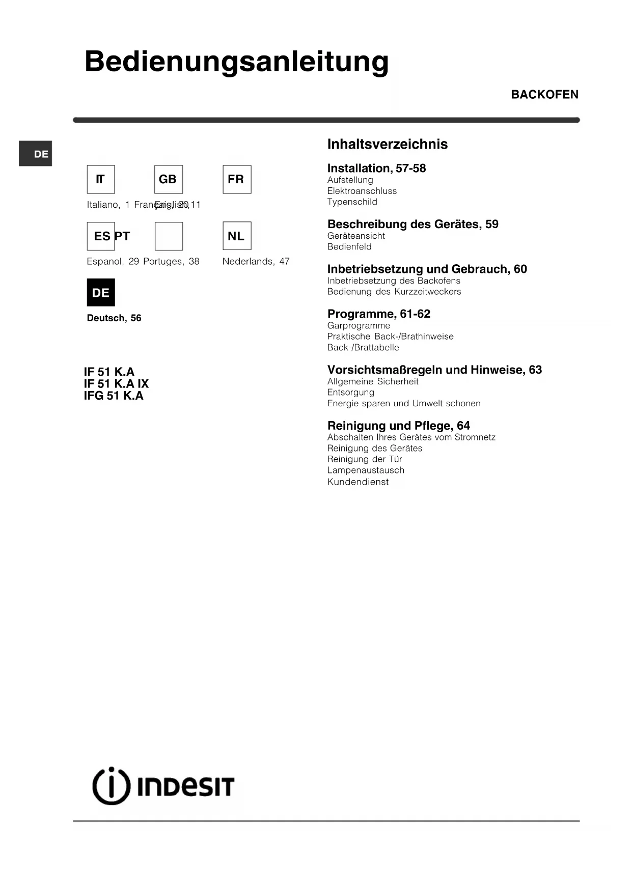 Laden Sie die Anleitung für Ihr Ofen kostenlos im PDF-Format! Finden Sie Ihr Handbuch IFG 51 K.A GR - INDESIT und nehmen Sie Ihr elektronisches Gerät wieder in die Hand. Auf dieser Seite sind alle Dokumente veröffentlicht, die für die Verwendung Ihres Geräts notwendig sind. IFG 51 K.A GR von der Marke INDESIT.