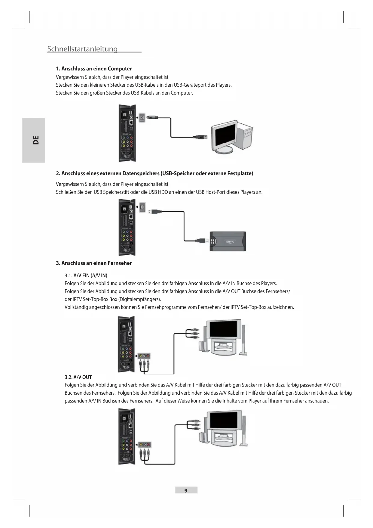 Folgen Sie der Abbildung und verbinden Sie das A/V Kabel mit Hilfe der drei farbigen Stecker mit den dazu farbig passenden A/V OUT- Buchsen des Fernsehers. Folgen Sie der Abbildung und verbinden Sie das A/V Kabel mit Hilfe der drei farbigen Stecker mit den dazu farbig passenden A/V IN Buchsen des Fernsehers. Auf dieser Weise können Sie die Inhalte vom Player auf Ihrem Fernseher anschauen. DE10