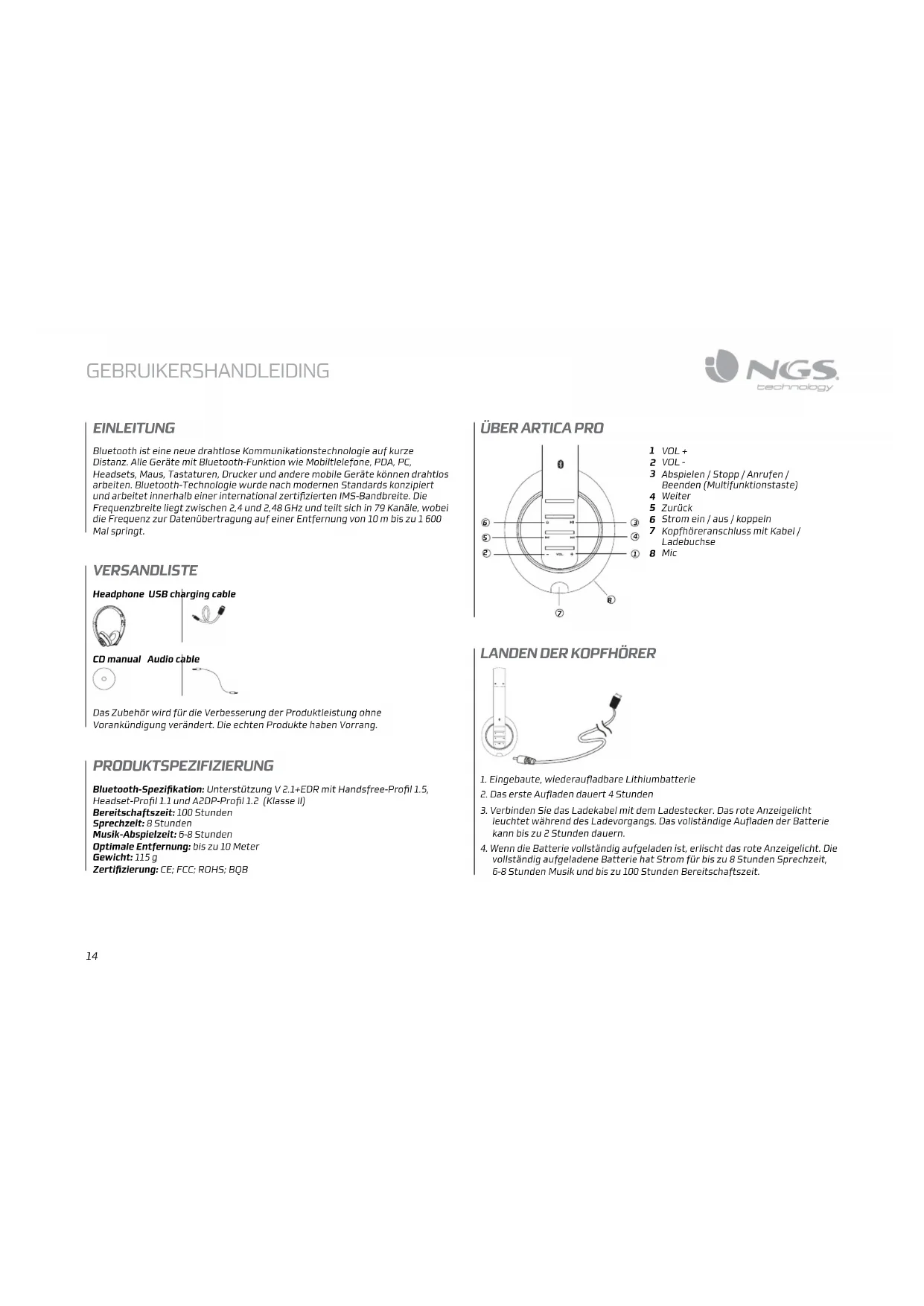 BEDIENUNGSANLEITUNG White Artica Pro bluetooth NGS