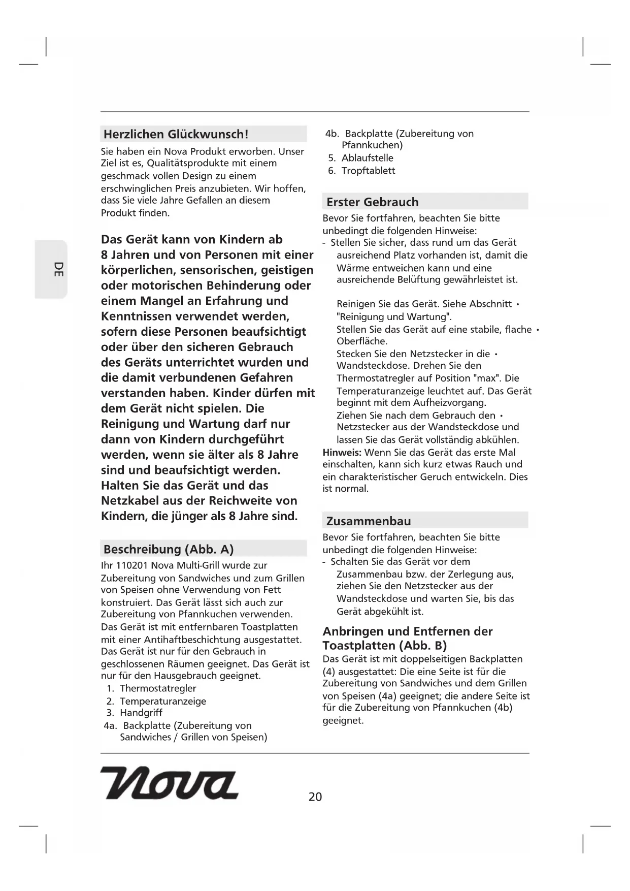 Herzlichen Glückwunsch! Sie haben ein Nova Produkt erworben. Unser Ziel ist es, Qualitätsprodukte mit einem geschmack vollen Design zu einem erschwinglichen Preis anzubieten. Wir hoffen, dass Sie viele Jahre Gefallen an diesem Produkt finden. Das Gerät kann von Kindern ab 8 Jahren und von Personen mit einer körperlichen, sensorischen, geistigen oder motorischen Behinderung oder einem Mangel an Erfahrung und Kenntnissen verwendet werden, sofern diese Personen beaufsichtigt oder über den sicheren Gebrauch des Geräts unterrichtet wurden und die damit verbundenen Gefahren verstanden haben. Kinder dürfen mit dem Gerät nicht spielen. Die Reinigung und Wartung darf nur dann von Kindern durchgeführt werden, wenn sie älter als 8 Jahre sind und beaufsichtigt werden. Halten Sie das Gerät und das Netzkabel aus der Reichweite von Kindern, die jünger als 8 Jahre sind. Beschreibung (Abb. A) Ihr 110201 Nova Multi-Grill wurde zur Zubereitung von Sandwiches und zum Grillen von Speisen ohne Verwendung von Fett konstruiert. Das Gerät lässt sich auch zur Zubereitung von Pfannkuchen verwenden. Das Gerät ist mit entfernbaren Toastplatten mit einer Antihaftbeschichtung ausgestattet. Das Gerät ist nur für den Gebrauch in geschlossenen Räumen geeignet. Das Gerät ist nur für den Hausgebrauch geeignet.