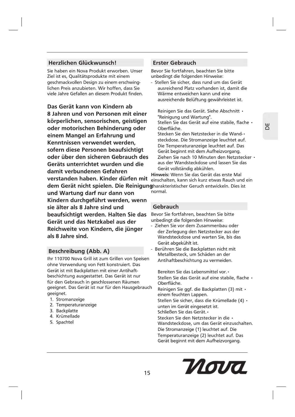 Herzlichen Glückwunsch! Sie haben ein Nova Produkt erworben. Unser Ziel ist es, Qualitätsprodukte mit einem geschmackvollen Design zu einem erschwing- lichen Preis anzubieten. Wir hoffen, dass Sie viele Jahre Gefallen an diesem Produkt finden. Das Gerät kann von Kindern ab 8 Jahren und von Personen mit einer körperlichen, sensorischen, geistigen oder motorischen Behinderung oder einem Mangel an Erfahrung und Kenntnissen verwendet werden, sofern diese Personen beaufsichtigt oder über den sicheren Gebrauch des Geräts unterrichtet wurden und die damit verbundenen Gefahren verstanden haben. Kinder dürfen mit dem Gerät nicht spielen. Die Reinigung und Wartung darf nur dann von Kindern durchgeführt werden, wenn sie älter als 8 Jahre sind und beaufsichtigt werden. Halten Sie das Gerät und das Netzkabel aus der Reichweite von Kindern, die jünger als 8 Jahre sind. Beschreibung (Abb. A) Ihr 110700 Nova Grill ist zum Grillen von Speisen ohne Verwendung von Fett konstruiert. Das Gerät ist mit Backplatten mit einer Antihaft- beschichtung ausgestattet. Das Gerät ist nur für den Gebrauch in geschlossenen Räumen geeignet. Das Gerät ist nur für den Hausgebrauch geeignet.
