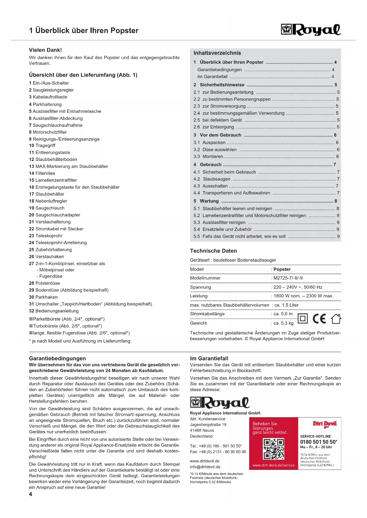 Finden Sie kostenlos die Bedienungsanleitung des Geräts Popster M27258 DIRT DEVIL als PDF.