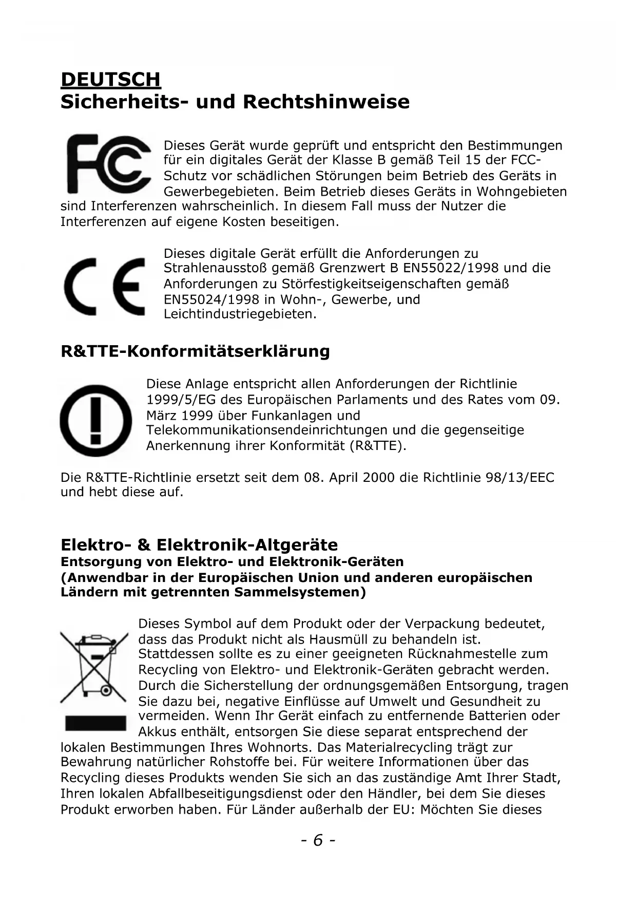 Elektro- & Elektronik-Altgeräte Entsorgung von Elektro- und Elektronik-Geräten (Anwendbar in der Europäischen Union und anderen europäischen Ländern mit getrennten Sammelsystemen) Dieses Symbol auf dem Produkt oder der Verpackung bedeutet, dass das Produkt nicht als Hausmüll zu behandeln ist. Stattdessen sollte es zu einer geeigneten Rücknahmestelle zum Recycling von Elektro- und Elektronik-Geräten gebracht werden. Durch die Sicherstellung der ordnungsgemäßen Entsorgung, tragen Sie dazu bei, negative Einflüsse auf Umwelt und Gesundheit zu vermeiden. Wenn Ihr Gerät einfach zu entfernende Batterien oder Akkus enthält, entsorgen Sie diese separat entsprechend der lokalen Bestimmungen Ihres Wohnorts. Das Materialrecycling trägt zur Bewahrung natürlicher Rohstoffe bei. Für weitere Informationen über das Recycling dieses Produkts wenden Sie sich an das zuständige Amt Ihrer Stadt, Ihren lokalen Abfallbeseitigungsdienst oder den Händler, bei dem Sie dieses Produkt erworben haben. Für Länder außerhalb der EU: Möchten Sie dieses- 7 -