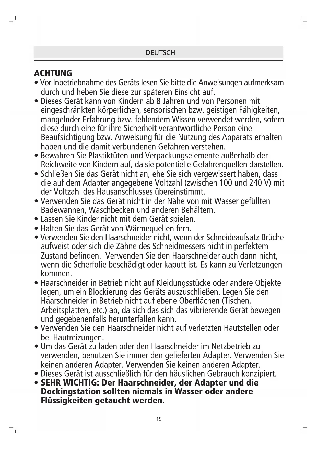- SEHR WICHTIG: Der Haarschneider, der Adapter und die Dockingstation sollten niemals in Wasser oder andere Flüssigkeiten getaucht werden.20
