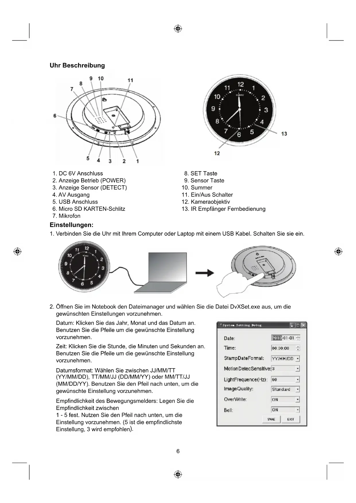 Anmerkung: die Kamera ist in der Uhr mit einen Winkel von 17 Grad nach unten angebracht. Der Sichtwinkel der Linse ist 45 Grad. - Verbinden Sie den Netzadapter.