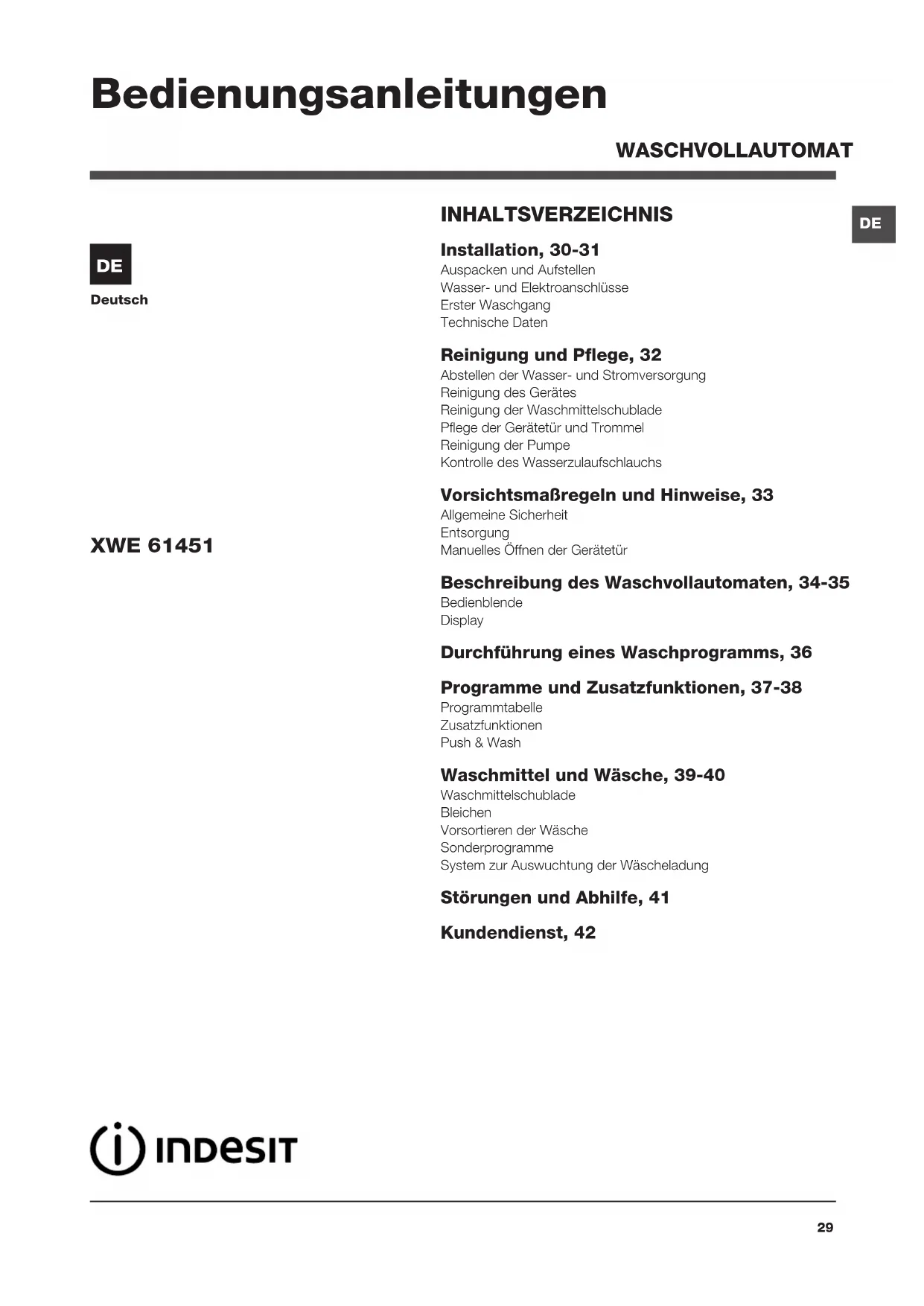 DE WASCHVOLLAUTOMAT INHALTSVERZEICHNIS Installation, 30-31