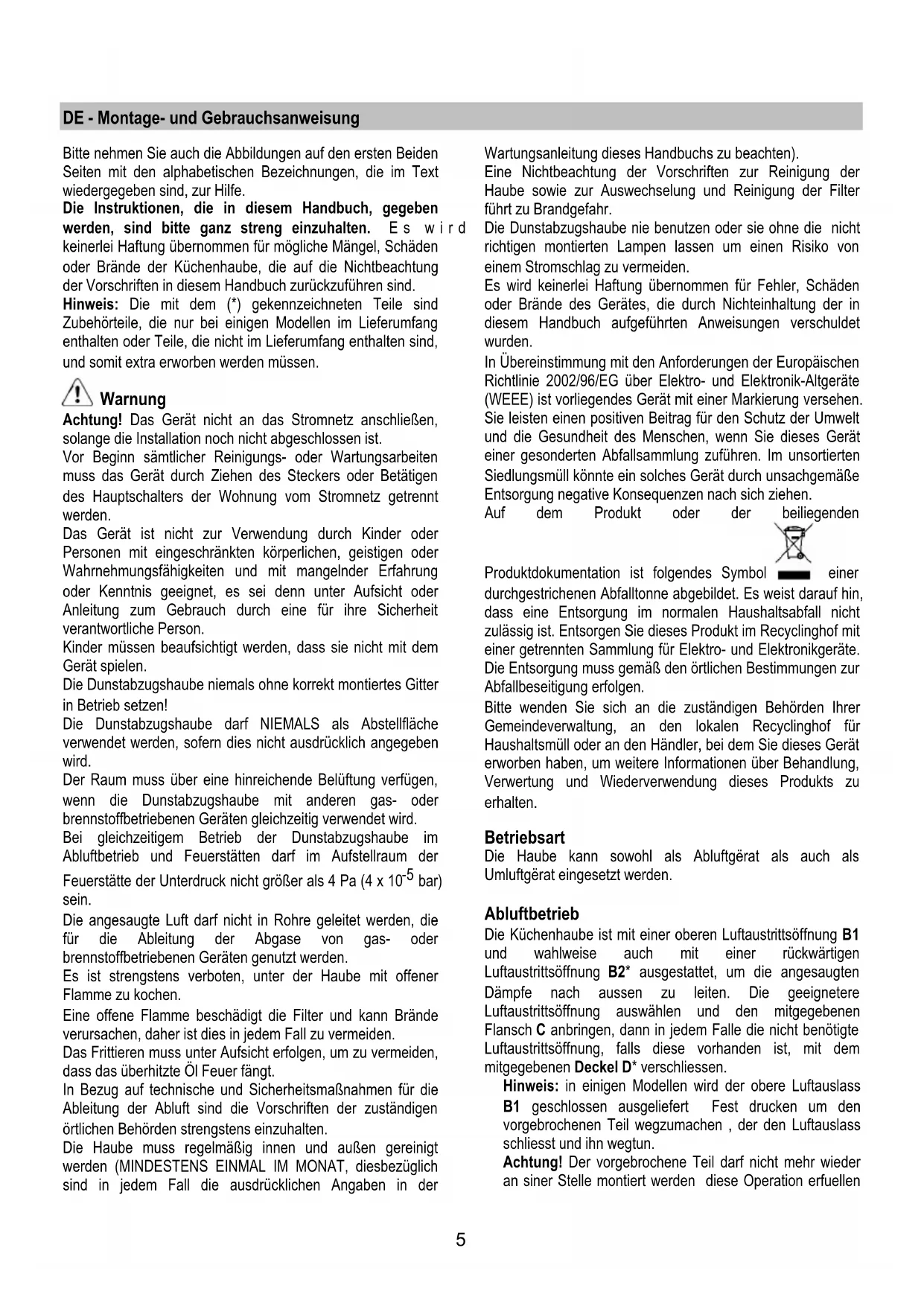 Die Dunstabzugshaube niemals ohne korrekt montiertes Gitter