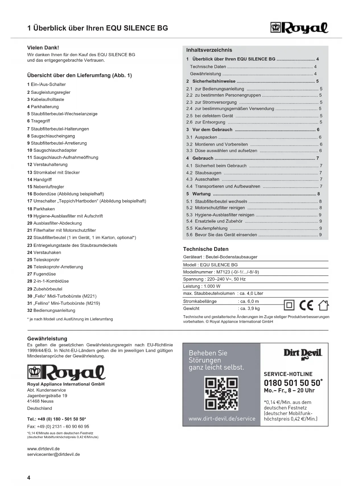 1 Überblick über Ihren EQU SILENCE BG 1 Überblick über Ihr en EQU SILENCE BG Vielen Dank! Wir danken Ihnen für den Kauf des EQU SILENCE BG und das entgegengebrachte Vertrauen. Übersicht über den Lieferumfang (Abb. 1) 1 Ein-/Aus-Schalter2 Saugleistungsregler3 Kabelaufrolltaste4 Parkhalterung5 Staubfilterbeutel-Wechselanzeige6 Tragegriff7 Staubfilterbeutel-Halterungen8 Saugschlaucheingang9 Staubfilterbeutel-Arretierung10 Saugschlauchadapter11 Saugschlauch-Aufnahmeöffnung12 Verstauhalterung13 Stromkabel mit Stecker14 Handgriff15 Nebenluftregler16 Bodendüse (Abbildung beispielhaft)17 Umschalter „Teppich/Hartboden“ (Abbildung beispielhaft)18 Parkhaken19 Hygiene-Ausblasfilter mit Aufschrift20 Ausblasfilter-Abdeckung21 Filterhalter mit Motorschutzfilter22 Staubfilterbeutel (1 im Gerät, 1 im Karton, optional*)23 Entriegelungstaste des Staubraumdeckels24 Verstauhaken25 Teleskoprohr26 Teleskoprohr-Arretierung27 Fugendüse28 2-in-1-Kombidüse29 Zubehörbeutel30 „Fello“ Midi-Turbobürste (M221)31 „Fellino“ Mini-Turbobürste (M219)32 Bedienungsanleitung* je nach Modell und Ausführung im Lieferumfang Inhaltsverzeichnis 1 Überblick über Ihren EQU SILENCE BG 4 Technische Daten 4 Gewährleistung 42 Sicherheitshinweise 52.1 zur Bedienungsanleitung 52.2 zu bestimmten Personengruppen 52.3 zur Stromversorgung 52.4 zur bestimmungsgemäßen Verwendung 52.5 bei defektem Gerät 52.6 zur Entsorgung 53 Vor dem Gebrauch 63.1 Auspacken 63.2 Montieren und Vorbereiten 63.3 Düse auswählen und aufsetzen 64 Gebrauch 74.1 Sicherheit beim Gebrauch 74.2 Staubsaugen 74.3 Ausschalten 74.4 Transportieren und Aufbewahren 75 Wartung 85.1 Staubfilterbeutel wechseln 85.2 Motorschutzfilter reinigen 85.3 Hygiene-Ausblasfilter reinigen 95.4 Ersatzteile und Zubehör 95.5 Kaufempfehlung 95.6 Bevor Sie das Gerät einsenden 9 Technische Daten Technische und gestalterische Änderungen im Zuge stetiger Produktverbesserungenvorbehalten. © Royal Appliance International GmbH Gewährleistung Es gelten die gesetzlichen Gewährleistungsregeln nach EU-Richtlinie1999/44/EG. In Nicht-EU-Ländern gelten die im jeweiligen Land gültigenMindestansprüche der Gewährleistung.Royal Appliance International GmbHAbt. KundenserviceJagenbergstraße 1941468 NeussDeutschlandTel.: +49 (0) 180 - 501 50 50*Fax: +49 (0) 2131 - 60 90 60 95*0,14 €/Minute aus dem deutschen Festnetz(deutscher Mobilfunkhöchstpreis 0,42 €/Minute)www.dirtdevil.deservicecenter@dirtdevil.deGeräteart : Beutel-BodenstaubsaugerModell : EQU SILENCE BGModellnummer : M7123 (-0/-1/.../-8/-9)Spannung : 220–240 V~, 50 HzLeistung : 1.000 Wmax. Staubbeutelvolumen : ca. 4,0 LiterStromkabellänge : ca. 6,0 m Gewicht : ca. 3,9 kg Beheben Sie