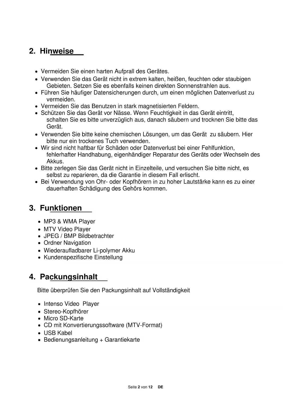 Bitte überprüfen Sie den Packungsinhalt auf Vollständigkeit Intenso Video Player Stereo-Kopfhörer Micro SD-Karte CD mit Konvertierungssoftware (MTV-Format) USB Kabel Bedienungsanleitung + GarantiekarteSeite 3 von 12 DE