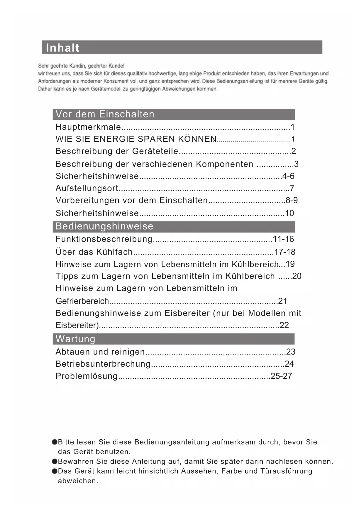 Tipps zum Lagern von Lebensmitteln im Kühlbereich 20 Bitte lesen Sie diese Bedienungsanleitung aufmerksam durch, bevor Siedas Gerät benutzen.Bewahren Sie diese Anleitung auf, damit Sie später darin nachlesen können.Das Gerät kann leicht hinsichtlich Aussehen, Farbe und Türausführungabweichen.Hauptmerkmale