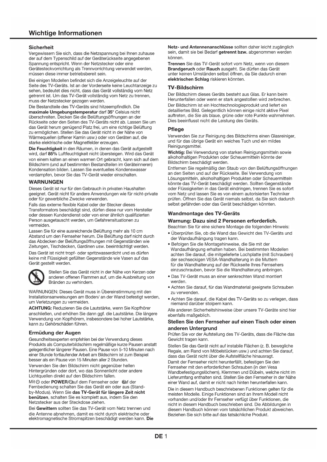 BackExitSelect Exit Menu BackExitSelect Exit MenuDE 1 Wichtige Informationen Sicherheit Vergewissern Sie sich, dass die Netzspannung bei Ihnen zuhause der auf dem Typenschild auf der Geräterückseite angegebenen Spannung entspricht. Wenn der Netzstecker oder eine Gerätesteckvorrichtung als Trennvorrichtung verwendet werden, müssen diese immer betriebsbereit sein. Bei einigen Modellen befindet sich die Anzeigeleuchte auf der Seite des TV-Geräts. Ist an der Vorderseite keine Leuchtanzeige zu sehen, bedeutet dies nicht, dass das Gerät vollständig vom Netz getrennt ist. Um das TV-Gerät vollständig vom Netz zu trennen, muss der Netzstecker gezogen werden. Die Bestandteile des TV-Geräts sind hitzeempfindlich. Die maximale Umgebungstemperatur darf 35° Celsius nicht überschreiten. Decken Sie die Belüftungsöffnungen an der Rückseite oder den Seiten des TV-Geräts nicht ab. Lassen Sie um das Gerät herum genügend Platz frei, um eine richtige Belüftung zu ermöglichen. Stellen Sie das Gerät nicht in der Nähe von Wärmequellen (offener Kamin usw.) oder von Geräten auf, die starke elektrische oder Magnetfelder erzeugen. Die Feuchtigkeit in den Räumen, in denen das Gerät aufgestellt wird, darf 85% Luftfeuchtigkeit nicht übersteigen. Wird das Gerät von einem kalten an einen warmen Ort gebracht, kann sich auf dem Bildschirm (und auf bestimmten Bestandteilen im Geräteinneren) Kondensation bilden. Lassen Sie eventuelles Kondenswasser verdampfen, bevor Sie das TV-Gerät wieder einschalten. WARNUNGEN Dieses Gerät ist nur für den Gebrauch in privaten Haushalten geeignet. Gerät nicht für andere Anwendungen wie für nicht-private oder für gewerbliche Zwecke verwenden. Falls das externe flexible Kabel oder der Stecker dieses Transformators beschädigt sind, dürfen diese nur vom Hersteller oder dessen Kundendienst oder von einer ähnlich qualifizierten Person ausgetauscht werden, um Gefahrensituationen zu vermeiden. Lassen Sie für eine ausreichende Belüftung mehr als 10 cm Abstand um den Fernseher herum. Die Belüftung darf nicht durch das Abdecken der Belüftungsöffnungen mit Gegenständen wie Zeitungen, Tischdecken, Gardinen usw. beeinträchtigt werden. Das Gerät ist nicht tropf- oder spritzwasserdicht und es dürfen keine mit Flüssigkeit gefüllten Gegenstände wie Vasen auf das Gerät gestellt werden. Stellen Sie das Gerät nicht in der Nähe von Kerzen oder anderen offenen Flammen auf, um die Ausbreitung von Bränden zu verhindern. WARNUNGEN: Dieses Gerät muss in Übereinstimmung mit den Installationsanweisungen am Boden/ an der Wand befestigt werden, um Verletzungen zu vermeiden. ACHTUNG: Reduzieren Sie die Lautstärke, wenn Sie Kopfhörer anschließen, und erhöhen Sie dann ggf. die Lautstärke. Die längere Verwendung von Kopfhörern, insbesondere bei hoher Lautstärke, kann zu Gehörschäden führen. Ermüdung der Augen Gesundheitsexperten empfehlen bei der Verwendung dieses Produkts als Computerbildschirm regelmäßige kurze Pausen anstatt gelegentlicher längerer Pausen. Eine Pause von 5-10 Minuten nach einer Stunde fortlaufender Arbeit am Bildschirm ist zum Beispiel besser als ein Pause von 15 Minuten aller 2 Stunden. Verwenden Sie den Bildschirm nicht gegenüber hellen Hintergründen oder dort, wo das Sonnenlicht oder andere Lichtquellen direkt auf den Bildschirm fallen. Mit oder POWER/ auf dem Fernseher oder auf der Fernbedienung schalten Sie das Gerät ein oder aus (Stand- by-Modus). Wenn Sie das TV-Gerät für längere Zeit nicht benützen, schalten Sie es komplett aus, indem Sie den Netzstecker aus der Steckdose ziehen. Bei Gewittern sollten Sie das TV-Gerät vom Netz trennen und die Antenne abnehmen, damit es nicht durch elektrische oder elektromagnetische Stromspitzen beschädigt werden kann. Die Netz- und Antennenanschlüsse sollten daher leicht zugänglich sein, damit sie bei Bedarf getrennt bzw. abgenommen werden können. Trennen Sie das TV-Gerät sofort vom Netz, wenn von diesem Brandgeruch oder Rauch ausgeht. Sie dürfen das Gerät unter keinen Umständen selbst öffnen, da Sie dadurch einen elektrischen Schlag riskieren könnten. TV-Bildschirm Der Bildschirm dieses Geräts besteht aus Glas. Er kann beim Herunterfallen oder wenn er stark angestoßen wird zerbrechen. Der Bildschirm ist ein Hochtechnologieprodukt und liefert ein detailliertes Bild. Gelegentlich können einige nicht aktive Pixel auftreten, die Sie als blaue, grüne oder rote Punkte wahrnehmen. Dies beeinflusst nicht die Leistung des Geräts. Pflege Verwenden Sie zur Reinigung des Bildschirms einen Glasreiniger, und für das übrige Gerät ein weiches Tuch und ein mildes Reinigungsmittel. Wichtig: Bei Verwendung von starken Reinigungsmitteln sowie alkoholhaltigen Produkten oder Scheuermitteln könnte der Bildschirm beschädigt werden. Entfernen Sie regelmäßig den Staub von den Belüftungsöffnungen an den Seiten und auf der Rückseite. Bei Verwendung von Lösungsmitteln, alkoholhaltigen Produkten oder Scheuermitteln könnte das TV-Gerät beschädigt werden. Sollten Gegenstände oder Flüssigkeiten in das Gerät eindringen, trennen Sie es sofort vom Netz und lassen Sie es von einem autorisierten Techniker prüfen. Öffnen Sie das Gerät niemals selbst, da Sie sich dadurch selbst gefährden oder das Gerät beschädigen könnten. Wandmontage des TV-Geräts Warnung: Dazu sind 2 Personen erforderlich. Beachten Sie für eine sichere Montage die folgenden Hinweis: