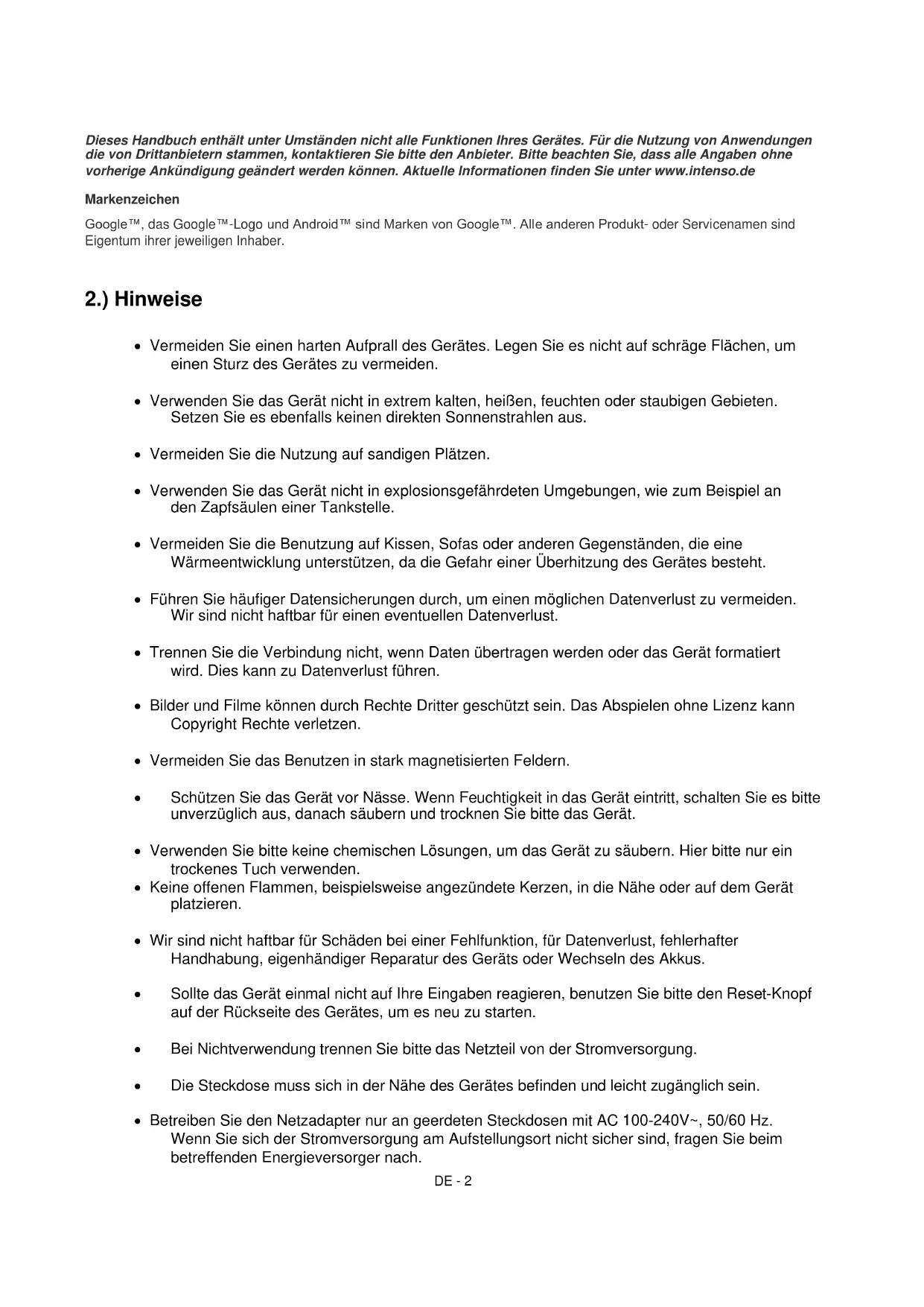 Dieses Handbuch enthalt unter Umständen nicht alle Funktionen Ihres Gerätes. Für die Nutzung von Anwendungen die von Drittanbietern stammen, kontaktieren Sieitte den Anbieter.itte beachten Sie,dass alle Angaben ohne vorherige Ankündigung geändert werden konnen. Aktuelle Informationen finden Sie unter www.intenso.de