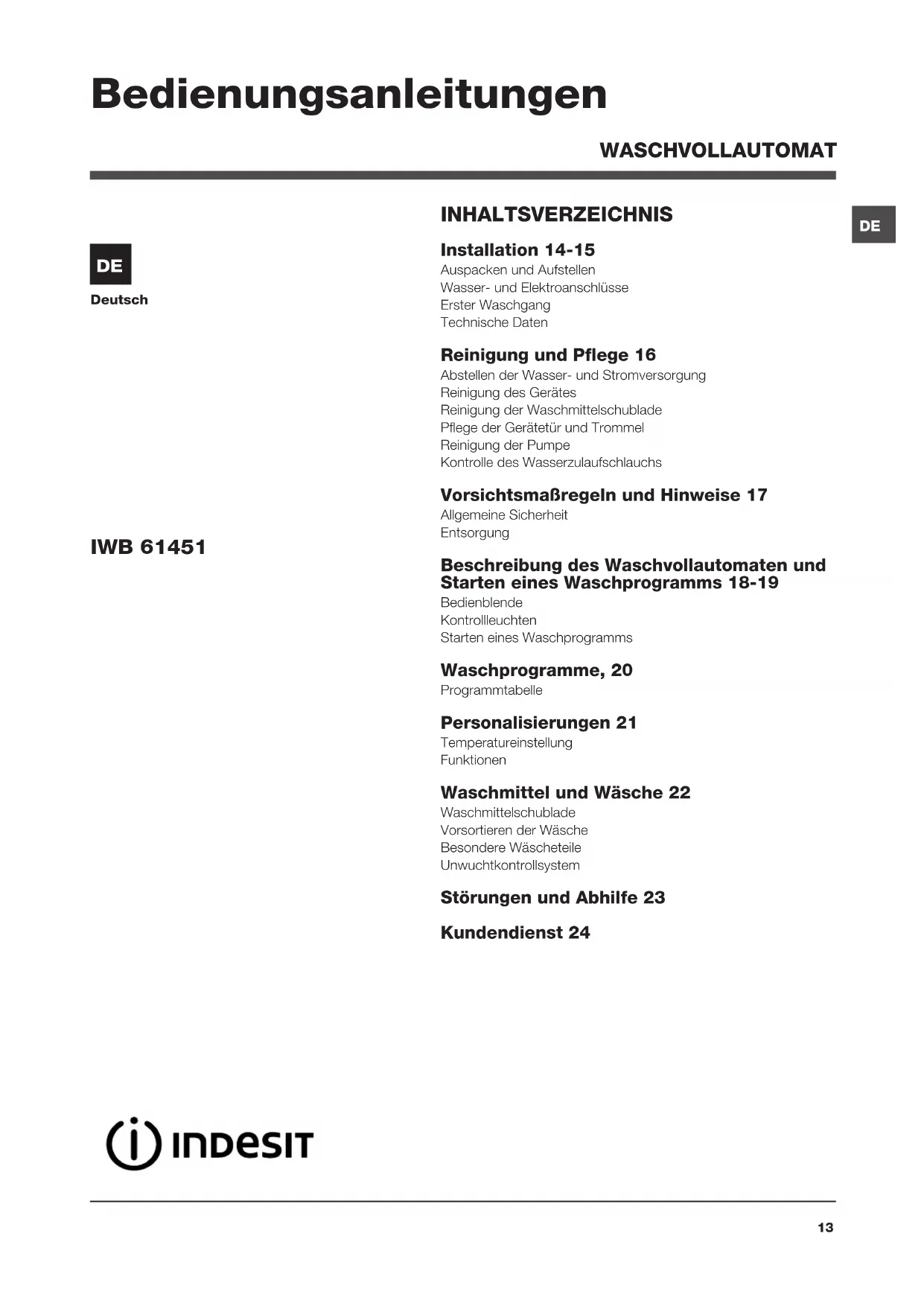 BEDIENUNGSANLEITUNG IWB 61451 C ECO EU INDESIT