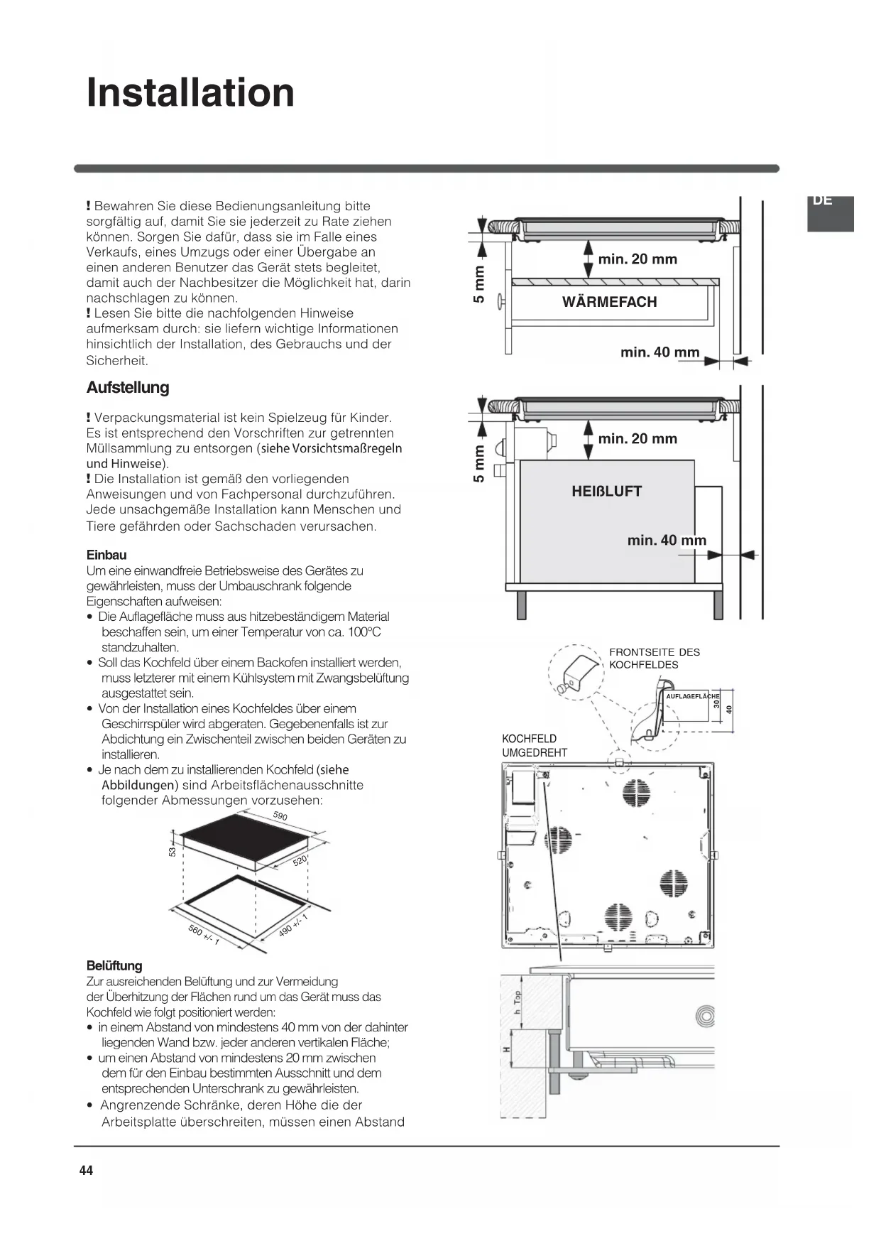- um einen Abstand von mindestens 20 mm zwischen dem für den Einbau bestimmten Ausschnitt und dem entsprechenden Unterschrank zu gewährleisten.