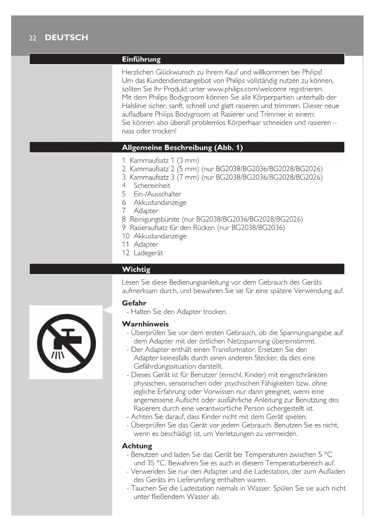Laden Sie die Anleitung für Ihr Rasenmäher kostenlos im PDF-Format! Finden Sie Ihr Handbuch Bodygroom Series 3000 BG2026 - PHILIPS und nehmen Sie Ihr elektronisches Gerät wieder in die Hand. Auf dieser Seite sind alle Dokumente veröffentlicht, die für die Verwendung Ihres Geräts notwendig sind. Bodygroom Series 3000 BG2026 von der Marke PHILIPS.