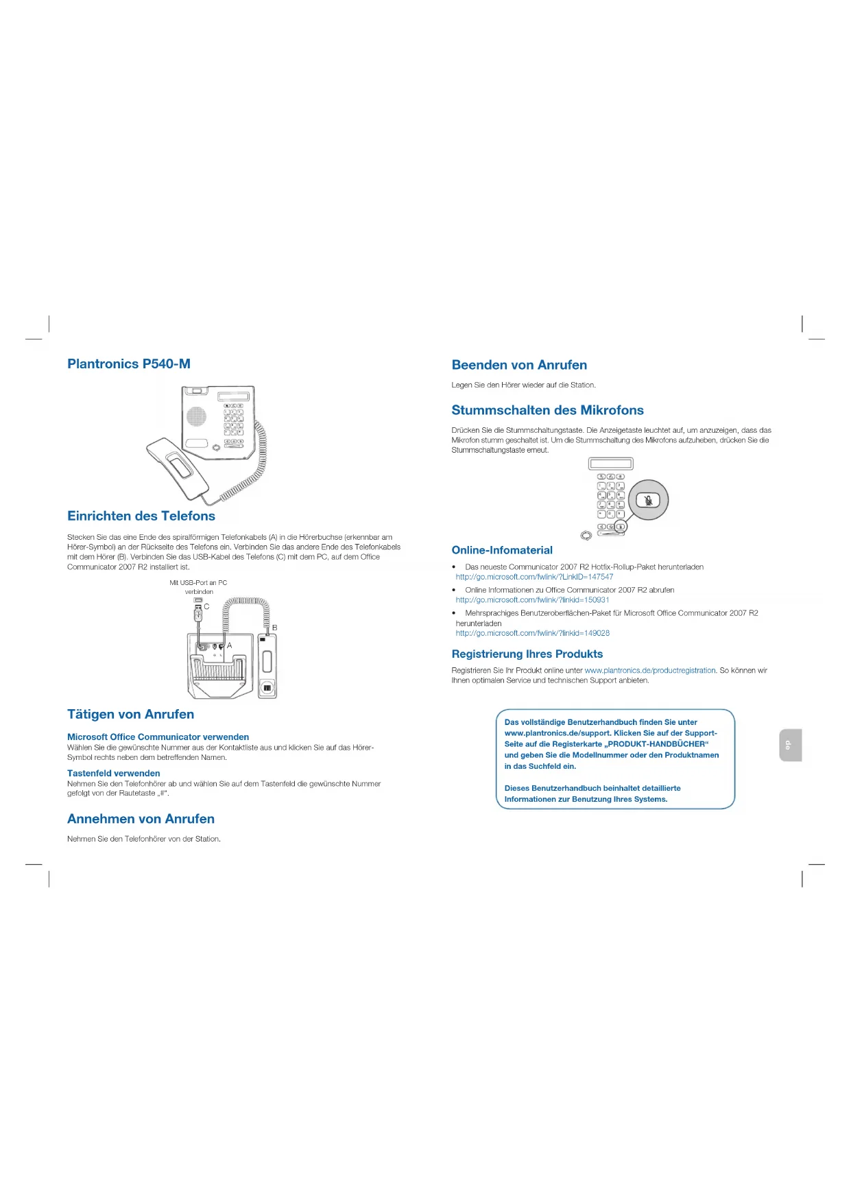 MitUSB-PortanPCverbinden Plantronics P540-M Tätigen von Anrufen Microsoft Office Communicator verwenden WählenSiediegewünschteNummerausderKontaktlisteausundklickenSieaufdasHörer- SymbolrechtsnebendembetreffendenNamen. Tastenfeld verwenden NehmenSiedenTelefonhörerabundwählenSieaufdemTastenfelddiegewünschteNummer gefolgt von der Rautetaste „#“. Annehmen von Anrufen NehmenSiedenTelefonhörervonderStation. Das vollständige Benutzerhandbuch finden Sie unter www.plantronics.de/support. Klicken Sie auf der Support- Seite auf die Registerkarte „PRODUKT-HANDBÜCHER“ und geben Sie die Modellnummer oder den Produktnamen in das Suchfeld ein. Dieses Benutzerhandbuch beinhaltet detaillierte Informationen zur Benutzung Ihres Systems.es Beschränkte Gewährleistung PlantronicsbieteteinebeschränkteGarantiefürein(1)Jahr.VollständigeGarantieinformationen,Bedingungenund technischeUnterstützungndenSieaufunsererWebsite:www. plantronics.de/support. Sicherheitshinweise BittelesenSievorderVerwendungdiesesProduktsdiefolgendenSicherheitshinweisesorgfältigdurch:• ProdukteignetsichausschließlichfürdenEinsatzingeschlossenenRäumen.