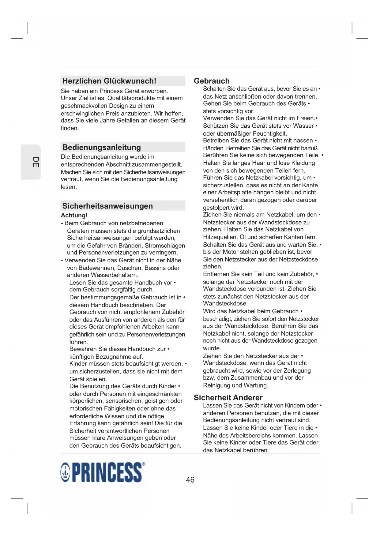 Gebrauch Schalten Sie das Gerät aus, bevor Sie es an das Netz anschließen oder davon trennen. Gehen Sie beim Gebrauch des Geräts stets vorsichtig vor. Verwenden Sie das Gerät nicht im Freien. Schützen Sie das Gerät stets vor Wasser oder übermäßiger Feuchtigkeit. Betreiben Sie das Gerät nicht mit nassen Händen. Betreiben Sie das Gerät nicht barfuß. Berühren Sie keine sich bewegenden Teile. Halten Sie langes Haar und lose Kleidung von den sich bewegenden Teilen fern. Führen Sie das Netzkabel vorsichtig, um sicherzustellen, dass es nicht an der Kante einer Arbeitsplatte hängen bleibt und nicht versehentlich daran gezogen oder darüber gestolpert wird. Ziehen Sie niemals am Netzkabel, um den Netzstecker aus der Wandsteckdose zu ziehen. Halten Sie das Netzkabel von Hitzequellen, Öl und scharfen Kanten fern. Schalten Sie das Gerät aus und warten Sie, bis der Motor stehen geblieben ist, bevor Sie den Netzstecker aus der Netzsteckdose ziehen. Entfernen Sie kein Teil und kein Zubehör, solange der Netzstecker noch mit der Wandsteckdose verbunden ist. Ziehen Sie stets zunächst den Netzstecker aus der Wandsteckdose. Wird das Netzkabel beim Gebrauch beschädigt, ziehen Sie sofort den Netzstecker aus der Wandsteckdose. Berühren Sie das Netzkabel nicht, solange der Netzstecker noch nicht aus der Wandsteckdose gezogen wurde. Ziehen Sie den Netzstecker aus der Wandsteckdose, wenn das Gerät nicht gebraucht wird, sowie vor der Zerlegung bzw. dem Zusammenbau und vor der Reinigung und Wartung. Sicherheit Anderer Lassen Sie das Gerät nicht von Kindern oder anderen Personen benutzen, die mit dieser Bedienungsanleitung nicht vertraut sind. Lassen Sie keine Kinder oder Tiere in die Nähe des Arbeitsbereichs kommen. Lassen Sie keine Kinder oder Tiere das Gerät oder das Netzkabel berühren. Herzlichen Glückwunsch! Sie haben ein Princess Gerät erworben. Unser Ziel ist es, Qualitätsprodukte mit einem geschmackvollen Design zu einem erschwinglichen Preis anzubieten. Wir hoffen, dass Sie viele Jahre Gefallen an diesem Gerät finden. Bedienungsanleitung Die Bedienungsanleitung wurde im entsprechenden Abschnitt zusammengestellt. Machen Sie sich mit den Sicherheitsanweisungen vertraut, wenn Sie die Bedienungsanleitung lesen. Sicherheitsanweisungen Achtung! - Beim Gebrauch von netzbetriebenen Geräten müssen stets die grundsätzlichen Sicherheitsanweisungen befolgt werden, um die Gefahr von Bränden, Stromschlägen und Personenverletzungen zu verringern. - Verwenden Sie das Gerät nicht in der Nähe von Badewannen, Duschen, Bassins oder anderen Wasserbehältern. Lesen Sie das gesamte Handbuch vor dem Gebrauch sorgfältig durch. Der bestimmungsgemäße Gebrauch ist in diesem Handbuch beschrieben. Der Gebrauch von nicht empfohlenem Zubehör oder das Ausführen von anderen als den für dieses Gerät empfohlenen Arbeiten kann gefährlich sein und zu Personenverletzungen führen. Bewahren Sie dieses Handbuch zur künftigen Bezugnahme auf. Kinder müssen stets beaufsichtigt werden, um sicherzustellen, dass sie nicht mit dem Gerät spielen. Die Benutzung des Geräts durch Kinder oder durch Personen mit eingeschränkten körperlichen, sensorischen, geistigen oder motorischen Fähigkeiten oder ohne das erforderliche Wissen und die nötige Erfahrung kann gefährlich sein! Die für die Sicherheit verantwortlichen Personen müssen klare Anweisungen geben oder den Gebrauch des Geräts beaufsichtigen.47