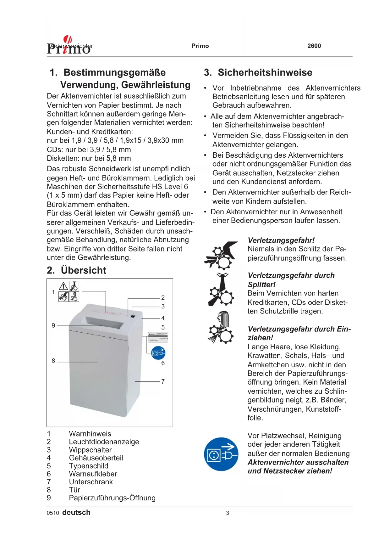 CDs: nur bei 3,9 / 5,8 mm Disketten: nur bei 5,8 mm Das robuste Schneidwerk ist unempfi ndlich gegen Heft- und Büroklammern. Lediglich bei Maschinen der Sicherheitsstufe HS Level 6 (1 x 5 mm) darf das Papier keine Heft- oder Büroklammern enthalten. Für das Gerät leisten wir Gewähr gemäß un- serer allgemeinen Verkaufs- und Lieferbedin- gungen. Verschleiß, Schäden durch unsach- gemäße Behandlung, natürliche Abnutzung bzw. Eingriffe von dritter Seite fallen nicht unter die Gewährleistung.Primo 2600 Aktenvernichter 4 deutsch 0510 Durchführung von Wartungs– und Servicearbeiten nur von:
