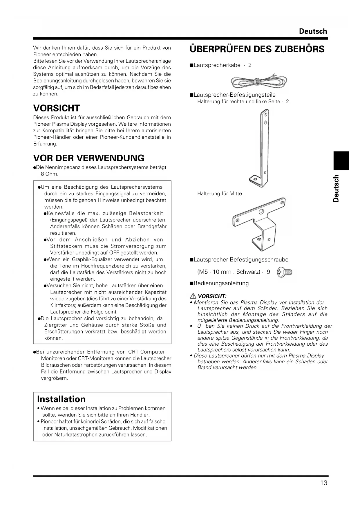 Deutsch Wir danken Ihnen dafür, dass Sie sich für ein Produkt vonPioneer entschieden haben.Bitte lesen Sie vor der Verwendung Ihrer Lautsprecheranlagediese Anleitung aufmerksam durch, um die Vorzüge desSystems optimal ausnützen zu können. Nachdem Sie dieBedienungsanleitung durchgelesen haben, bewahren Sie siesorgfältig auf, um sich im Bedarfsfall jederzeit darauf beziehenzu können. VORSICHT Dieses Produkt ist für ausschließlichen Gebrauch mit demPioneer Plasma Display vorgesehen. Weitere Informationenzur Kompatibilität bringen Sie bitte bei Ihrem autorisiertenPioneer-Händler oder einer Pioneer-Kundendienststelle inErfahrung. VOR DER VERWENDUNG ÷ Die Nennimpedanz dieses Lautsprechersystems beträgt8 Ohm.÷ Um eine Beschädigung des Lautsprechersystemsdurch ein zu starkes Eingangssignal zu vermeiden,müssen die folgenden Hinweise unbedingt beachtetwerden:÷ Keinesfalls die max. zulässige Belastbarkeit(Eingangspegel) der Lautsprecher überschreiten.Anderenfalls können Schäden oder Brandgefahrresultieren.÷ Vor dem Anschließen und Abziehen vonStiftsteckern muss die Stromversorgung zumVerstärker unbedingt auf OFF gestellt werden.÷ Wenn ein Graphik-Equalizer verwendet wird, umdie Töne im Hochfrequenzbereich zu verstärken,darf die Lautstärke des Verstärkers nicht zu hocheingestellt werden.÷ Versuchen Sie nicht, hohe Lautstärken über einenLautsprecher mit nicht ausreichender Kapazitätwiederzugeben (dies führt zu einer Verstärkung desKlirrfaktors; außerdem kann eine Beschädigung derLautsprecher die Folge sein).÷ Die Lautsprecher sind vorsichtig zu behandeln, daZiergitter und Gehäuse durch starke Stöße undErschütterungen verkratzt bzw. beschädigt werdenkönnen.÷ Bei unzureichender Entfernung von CRT-Computer-Monitoren oder CRT-Monitoren können die LautsprecherBildrauschen oder Farbstörungen verursachen. In diesemFall die Entfernung zwischen Lautsprecher und Displayvergrößern. Installation • Wenn es bei dieser Installation zu Problemen kommensollte, wenden Sie sich bitte an Ihren Händler.• Pioneer haftet für keinerlei Schäden, die sich auf falscheInstallation, unsachgemäßen Gebrauch, Modifikationenoder Naturkatastrophen zurückführen lassen. ÜBERPRÜFEN DES ZUBEHÖRS