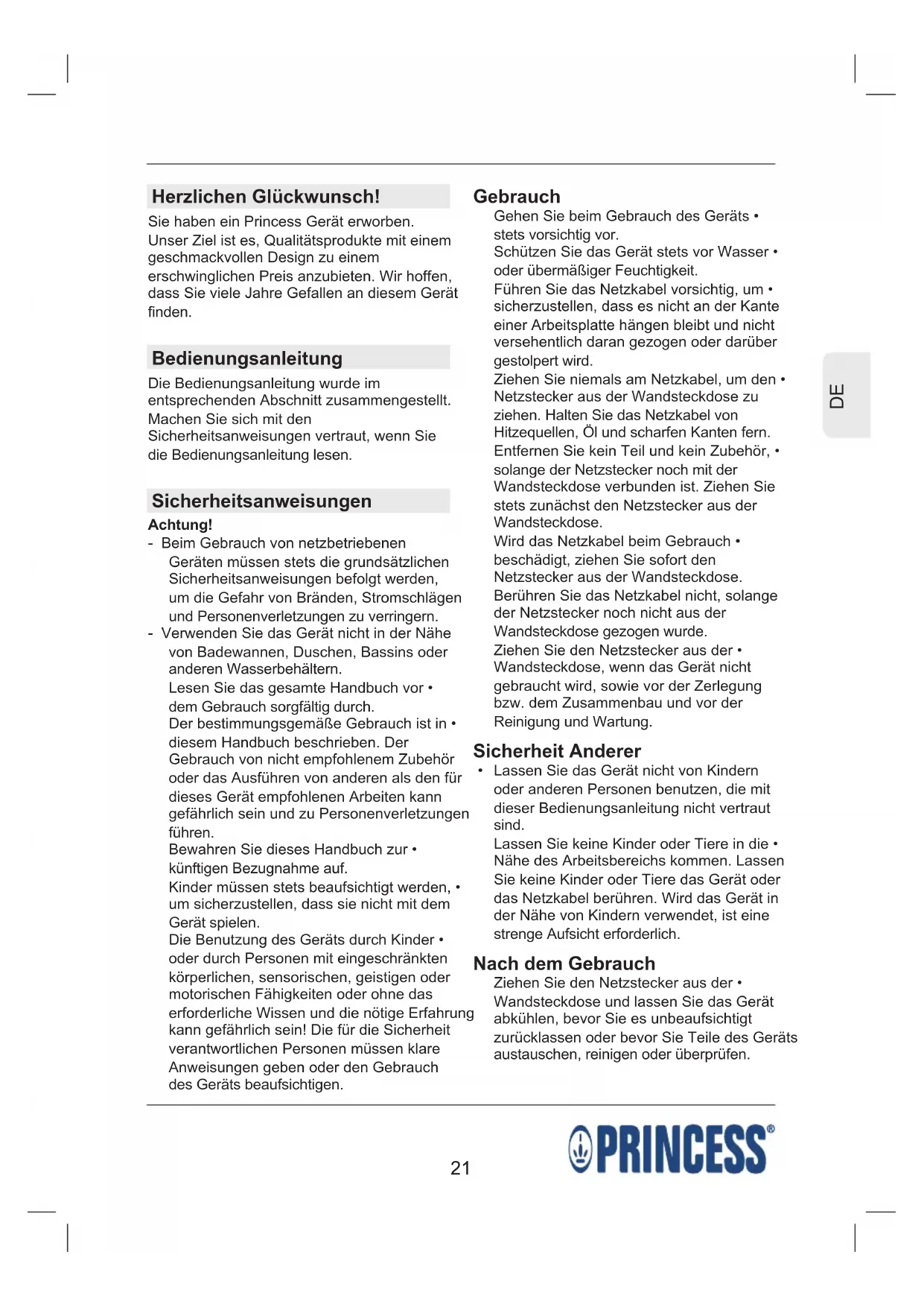 Herzlichen Glückwunsch! Sie haben ein Princess Gerät erworben. Unser Ziel ist es, Qualitätsprodukte mit einem geschmackvollen Design zu einem erschwinglichen Preis anzubieten. Wir hoffen, dass Sie viele Jahre Gefallen an diesem Gerät finden. Bedienungsanleitung Die Bedienungsanleitung wurde im entsprechenden Abschnitt zusammengestellt. Machen Sie sich mit den Sicherheitsanweisungen vertraut, wenn Sie die Bedienungsanleitung lesen. Sicherheitsanweisungen Achtung! - Beim Gebrauch von netzbetriebenen Geräten müssen stets die grundsätzlichen Sicherheitsanweisungen befolgt werden, um die Gefahr von Bränden, Stromschlägen und Personenverletzungen zu verringern. - Verwenden Sie das Gerät nicht in der Nähe von Badewannen, Duschen, Bassins oder anderen Wasserbehältern. Lesen Sie das gesamte Handbuch vor • dem Gebrauch sorgfältig durch. Der bestimmungsgemäße Gebrauch ist in • diesem Handbuch beschrieben. Der Gebrauch von nicht empfohlenem Zubehör oder das Ausführen von anderen als den für dieses Gerät empfohlenen Arbeiten kann gefährlich sein und zu Personenverletzungen führen. Bewahren Sie dieses Handbuch zur • künftigen Bezugnahme auf. Kinder müssen stets beaufsichtigt werden, • um sicherzustellen, dass sie nicht mit dem Gerät spielen. Die Benutzung des Geräts durch Kinder • oder durch Personen mit eingeschränkten körperlichen, sensorischen, geistigen oder motorischen Fähigkeiten oder ohne das erforderliche Wissen und die nötige Erfahrung kann gefährlich sein! Die für die Sicherheit verantwortlichen Personen müssen klare Anweisungen geben oder den Gebrauch des Geräts beaufsichtigen. Gebrauch Gehen Sie beim Gebrauch des Geräts • stets vorsichtig vor. Schützen Sie das Gerät stets vor Wasser • oder übermäßiger Feuchtigkeit. Führen Sie das Netzkabel vorsichtig, um • sicherzustellen, dass es nicht an der Kante einer Arbeitsplatte hängen bleibt und nicht versehentlich daran gezogen oder darüber gestolpert wird. Ziehen Sie niemals am Netzkabel, um den • Netzstecker aus der Wandsteckdose zu ziehen. Halten Sie das Netzkabel von Hitzequellen, Öl und scharfen Kanten fern. Entfernen Sie kein Teil und kein Zubehör, • solange der Netzstecker noch mit der Wandsteckdose verbunden ist. Ziehen Sie stets zunächst den Netzstecker aus der Wandsteckdose. Wird das Netzkabel beim Gebrauch • beschädigt, ziehen Sie sofort den Netzstecker aus der Wandsteckdose. Berühren Sie das Netzkabel nicht, solange der Netzstecker noch nicht aus der Wandsteckdose gezogen wurde. Ziehen Sie den Netzstecker aus der • Wandsteckdose, wenn das Gerät nicht gebraucht wird, sowie vor der Zerlegung bzw. dem Zusammenbau und vor der Reinigung und Wartung. Sicherheit Anderer Lassen Sie das Gerät nicht von Kindern • oder anderen Personen benutzen, die mit dieser Bedienungsanleitung nicht vertraut sind. Lassen Sie keine Kinder oder Tiere in die • Nähe des Arbeitsbereichs kommen. Lassen Sie keine Kinder oder Tiere das Gerät oder das Netzkabel berühren. Wird das Gerät in der Nähe von Kindern verwendet, ist eine strenge Aufsicht erforderlich. Nach dem Gebrauch Ziehen Sie den Netzstecker aus der • Wandsteckdose und lassen Sie das Gerät abkühlen, bevor Sie es unbeaufsichtigt zurücklassen oder bevor Sie Teile des Geräts austauschen, reinigen oder überprüfen.2222