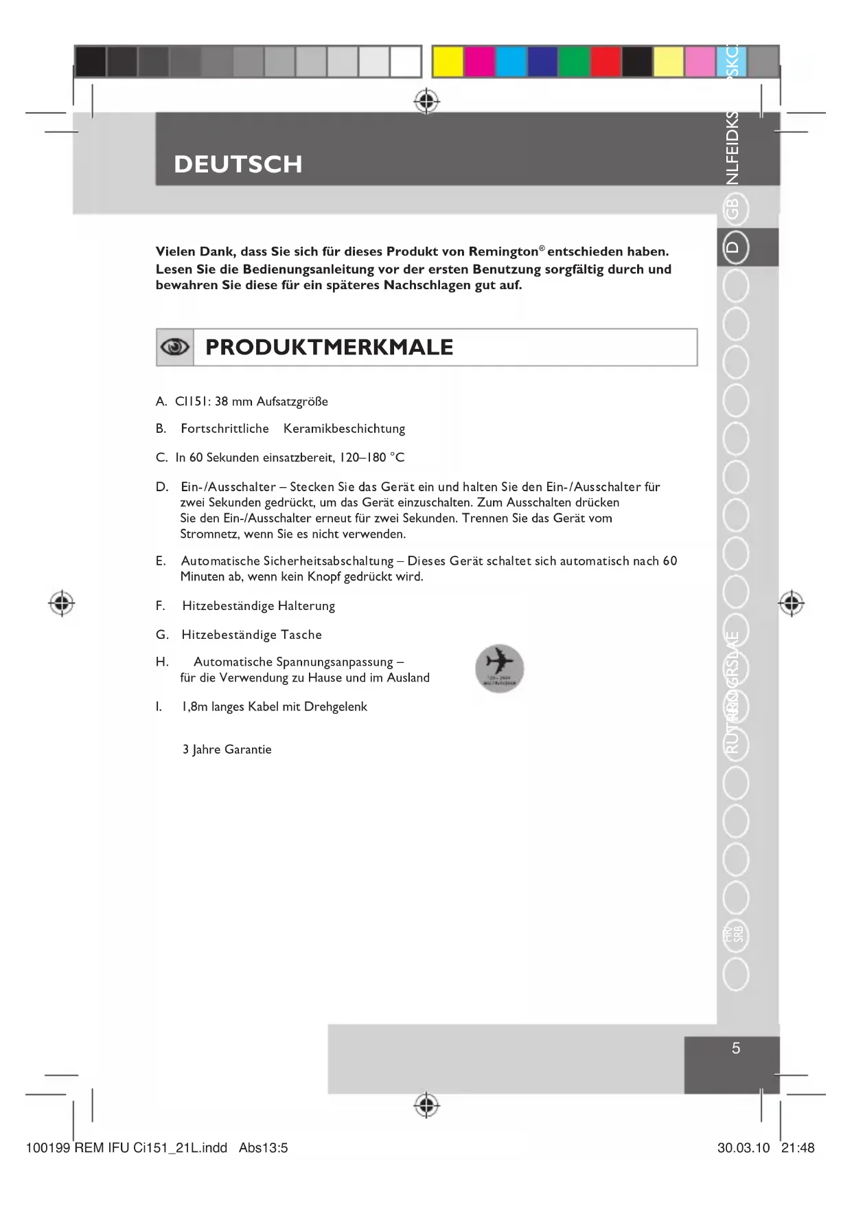 SRB D Vielen Dank, dass Sie sich für dieses Produkt von Remington ® entschieden haben.Lesen Sie die Bedienungsanleitung vor der ersten Benutzung sorgfältig durch und bewahren Sie diese für ein späteres Nachschlagen gut auf. PRODUKTMERKMALE A. CI151: 38 mm AufsatzgrößeB. Fortschrittliche KeramikbeschichtungC. In 60 Sekunden einsatzbereit, 120–180 °C D. Ein-/Ausschalter – Stecken Sie das Gerät ein und halten Sie den Ein-/Ausschalter für zwei Sekunden gedrückt, um das Gerät einzuschalten. Zum Ausschalten drücken Sie den Ein-/Ausschalter erneut für zwei Sekunden. Trennen Sie das Gerät vom Stromnetz, wenn Sie es nicht verwenden. E. Automatische Sicherheitsabschaltung – Dieses Gerät schaltet sich automatisch nach 60 Minuten ab, wenn kein Knopf gedrückt wird.F. Hitzebeständige HalterungG. Hitzebeständige TascheH. Automatische Spannungsanpassung –für die Verwendung zu Hause und im AuslandI. 1,8m langes Kabel mit Drehgelenk 3 Jahre Garantie 100199 REM IFU Ci151_21L.indd Abs13:5100199 REM IFU Ci151_21L.indd Abs13:5 30.03.10 21:4830.03.10 21:48DEUTSCH