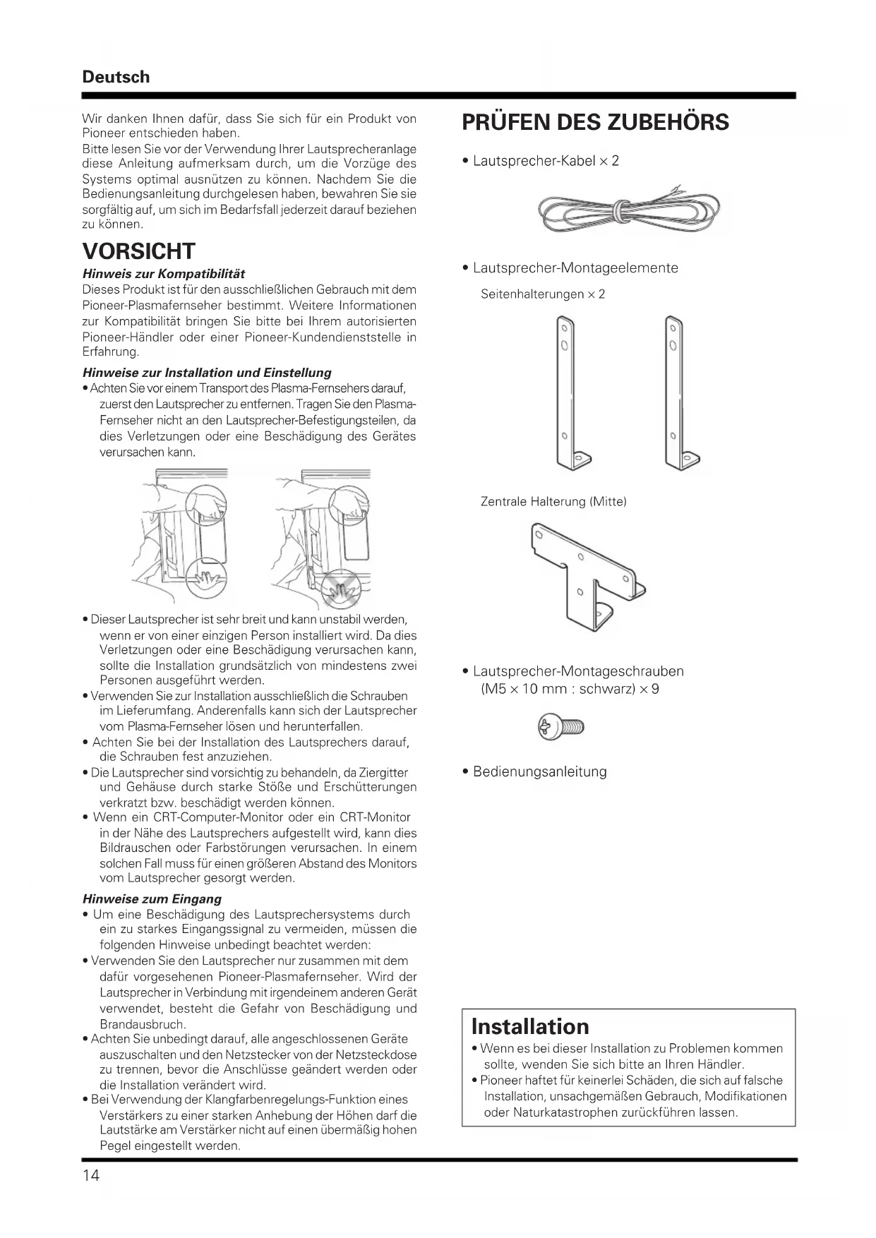 VORSICHT Hinweis zur Kompatibilität Dieses Produkt ist für den ausschließlichen Gebrauch mit demPioneer-Plasmafernseher bestimmt. Weitere Informationenzur Kompatibilität bringen Sie bitte bei Ihrem autorisiertenPioneer-Händler oder einer Pioneer-Kundendienststelle inErfahrung. Hinweise zur Installation und Einstellung • Achten Sie vor einem Transport des Plasma-Fernsehers darauf,zuerst den Lautsprecher zu entfernen. Tragen Sie den Plasma-Fernseher nicht an den Lautsprecher-Befestigungsteilen, dadies Verletzungen oder eine Beschädigung des Gerätesverursachen kann. PRÜFEN DES ZUBEHÖRS