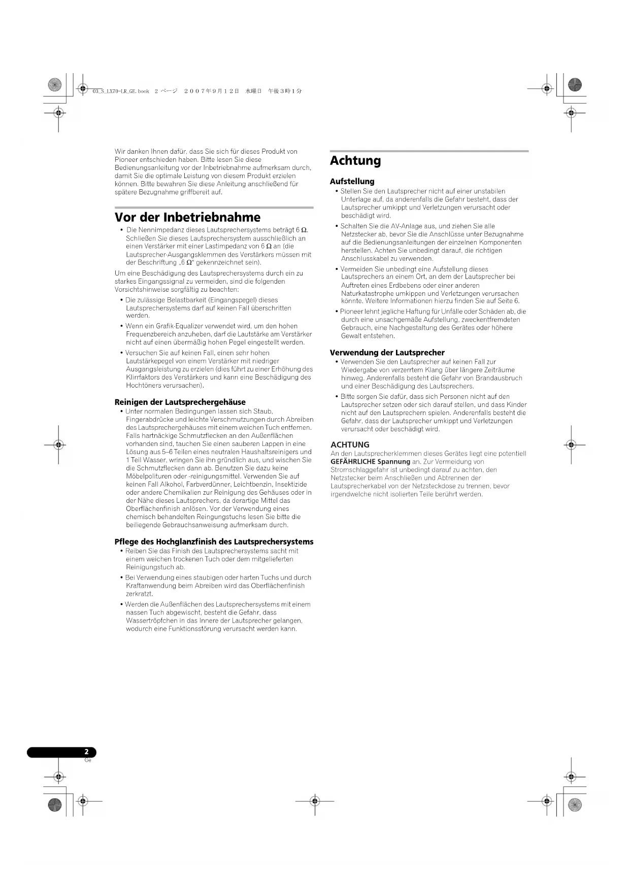 Ge Wir danken Ihnen dafür, dass Sie sich für dieses Produkt von Pioneer entschieden haben. Bitte lesen Sie diese Bedienungsanleitung vor der Inbetriebnahme aufmerksam durch, damit Sie die optimale Leistung von diesem Produkt erzielen können. Bitte bewahren Sie diese Anleitung anschließend für spätere Bezugnahme griffbereit auf. Vor der Inbetriebnahme