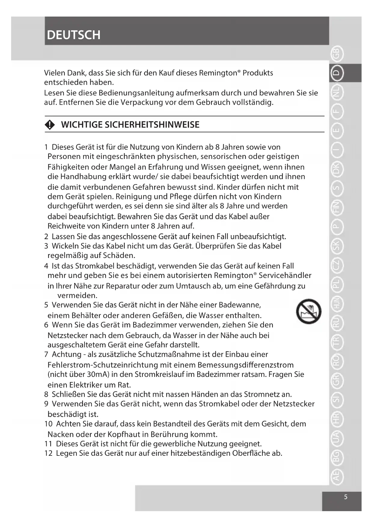 5 Verwenden Sie das Gerät nicht in der Nähe einer Badewanne,