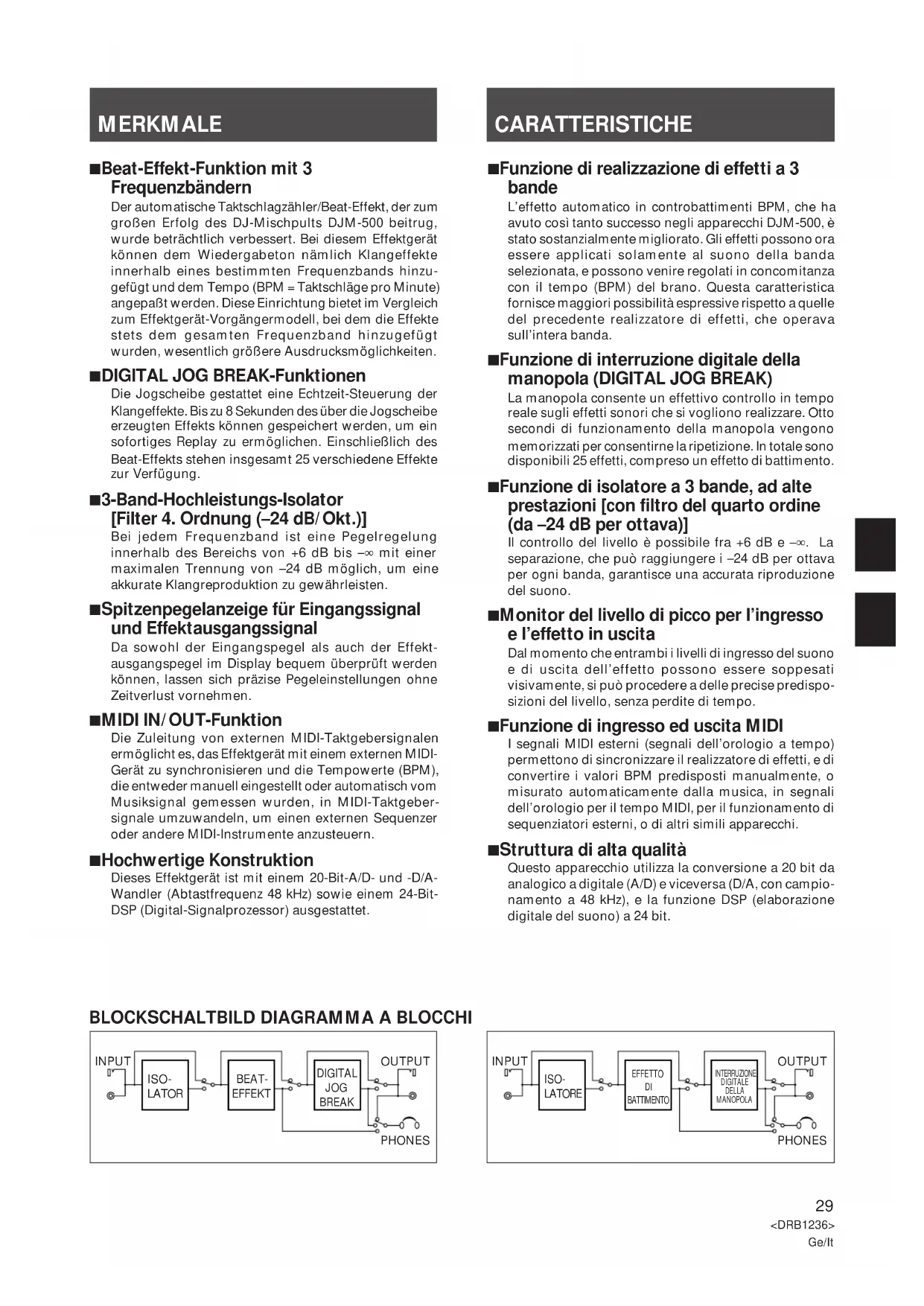 DIAGNOSTICA ....................................................53 DATI TECNICI ......................................................5329 <DRB1236> Ge/It MERKMALE 7 Beat-Effekt-Funktion mit 3 Frequenzbändern Der automatische Taktschlagzähler/Beat-Effekt, der zum großen Erfolg des DJ-Mischpults DJM-500 beitrug, wurde beträchtlich verbessert. Bei diesem Effektgerät können dem Wiedergabeton nämlich Klangeffekte innerhalb eines bestimmten Frequenzbands hinzu- gefügt und dem Tempo (BPM = Taktschläge pro Minute) angepaßt werden. Diese Einrichtung bietet im Vergleich zum Effektgerät-Vorgängermodell, bei dem die Effekte stets dem gesamten Frequenzband hinzugefügt wurden, wesentlich größere Ausdrucksmöglichkeiten. 7 DIGITAL JOG BREAK-Funktionen Die Jogscheibe gestattet eine Echtzeit-Steuerung der Klangeffekte. Bis zu 8 Sekunden des über die Jogscheibe erzeugten Effekts können gespeichert werden, um ein sofortiges Replay zu ermöglichen. Einschließlich des Beat-Effekts stehen insgesamt 25 verschiedene Effekte zur Verfügung. 7 3-Band-Hochleistungs-Isolator [Filter 4. Ordnung (–24 dB/Okt.)] Bei jedem Frequenzband ist eine Pegelregelung innerhalb des Bereichs von +6 dB bis –∞ mit einer maximalen Trennung von –24 dB möglich, um eine akkurate Klangreproduktion zu gewährleisten. 7 Spitzenpegelanzeige für Eingangssignal und Effektausgangssignal Da sowohl der Eingangspegel als auch der Effekt- ausgangspegel im Display bequem überprüft werden können, lassen sich präzise Pegeleinstellungen ohne Zeitverlust vornehmen. 7 MIDI IN/OUT-Funktion Die Zuleitung von externen MIDI-Taktgebersignalen ermöglicht es, das Effektgerät mit einem externen MIDI- Gerät zu synchronisieren und die Tempowerte (BPM), die entweder manuell eingestellt oder automatisch vom Musiksignal gemessen wurden, in MIDI-Taktgeber- signale umzuwandeln, um einen externen Sequenzer oder andere MIDI-Instrumente anzusteuern. 7 Hochwertige Konstruktion Dieses Effektgerät ist mit einem 20-Bit-A/D- und -D/A- Wandler (Abtastfrequenz 48 kHz) sowie einem 24-Bit- DSP (Digital-Signalprozessor) ausgestattet. CARATTERISTICHE 7 Funzione di realizzazione di effetti a 3 bande L’effetto automatico in controbattimenti BPM, che ha avuto così tanto successo negli apparecchi DJM-500, è stato sostanzialmente migliorato. Gli effetti possono ora essere applicati solamente al suono della banda selezionata, e possono venire regolati in concomitanza con il tempo (BPM) del brano. Questa caratteristica fornisce maggiori possibilità espressive rispetto a quelle del precedente realizzatore di effetti, che operava sull’intera banda. 7 Funzione di interruzione digitale della manopola (DIGITAL JOG BREAK) La manopola consente un effettivo controllo in tempo reale sugli effetti sonori che si vogliono realizzare. Otto secondi di funzionamento della manopola vengono memorizzati per consentirne la ripetizione. In totale sono disponibili 25 effetti, compreso un effetto di battimento. 7 Funzione di isolatore a 3 bande, ad alte prestazioni [con filtro del quarto ordine (da –24 dB per ottava)] Il controllo del livello è possibile fra +6 dB e –∞. La separazione, che può raggiungere i –24 dB per ottava per ogni banda, garantisce una accurata riproduzione del suono. 7 Monitor del livello di picco per l’ingresso e l’effetto in uscita Dal momento che entrambi i livelli di ingresso del suono e di uscita dell’effetto possono essere soppesati visivamente, si può procedere a delle precise predispo- sizioni del livello, senza perdite di tempo. 7 Funzione di ingresso ed uscita MIDI I segnali MIDI esterni (segnali dell’orologio a tempo) permettono di sincronizzare il realizzatore di effetti, e di convertire i valori BPM predisposti manualmente, o misurato automaticamente dalla musica, in segnali dell’orologio per il tempo MIDI, per il funzionamento di sequenziatori esterni, o di altri simili apparecchi. 7 Struttura di alta qualità Questo apparecchio utilizza la conversione a 20 bit da analogico a digitale (A/D) e viceversa (D/A, con campio- namento a 48 kHz), e la funzione DSP (elaborazione digitale del suono) a 24 bit.